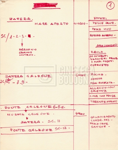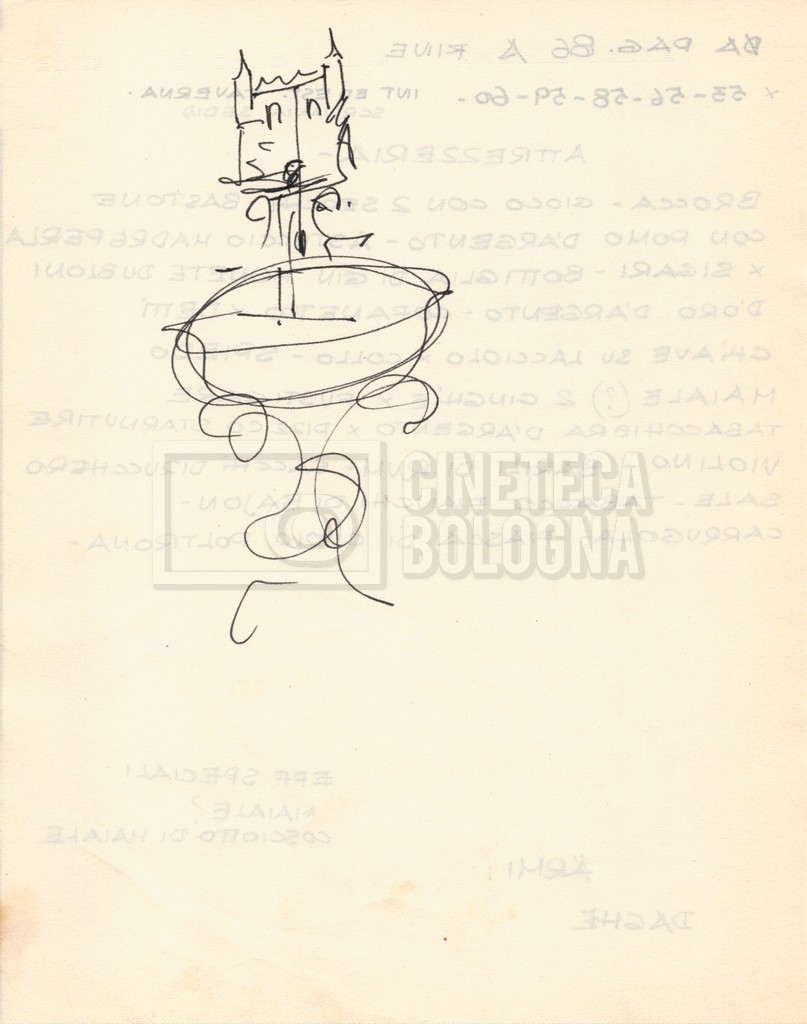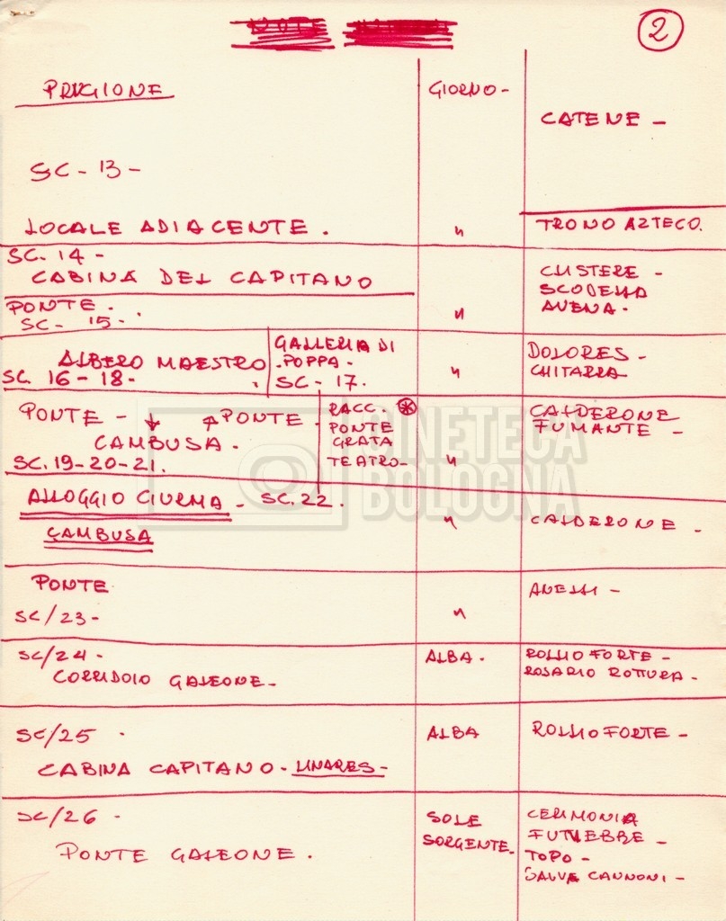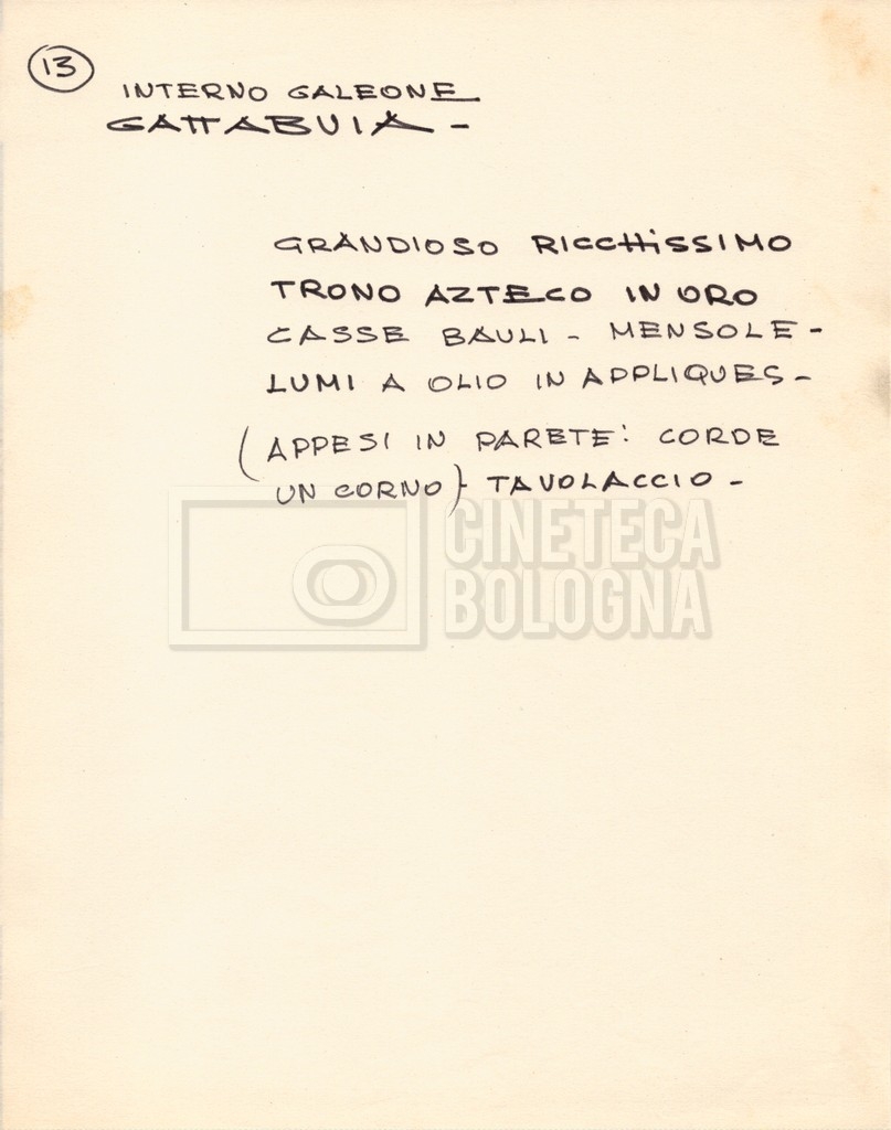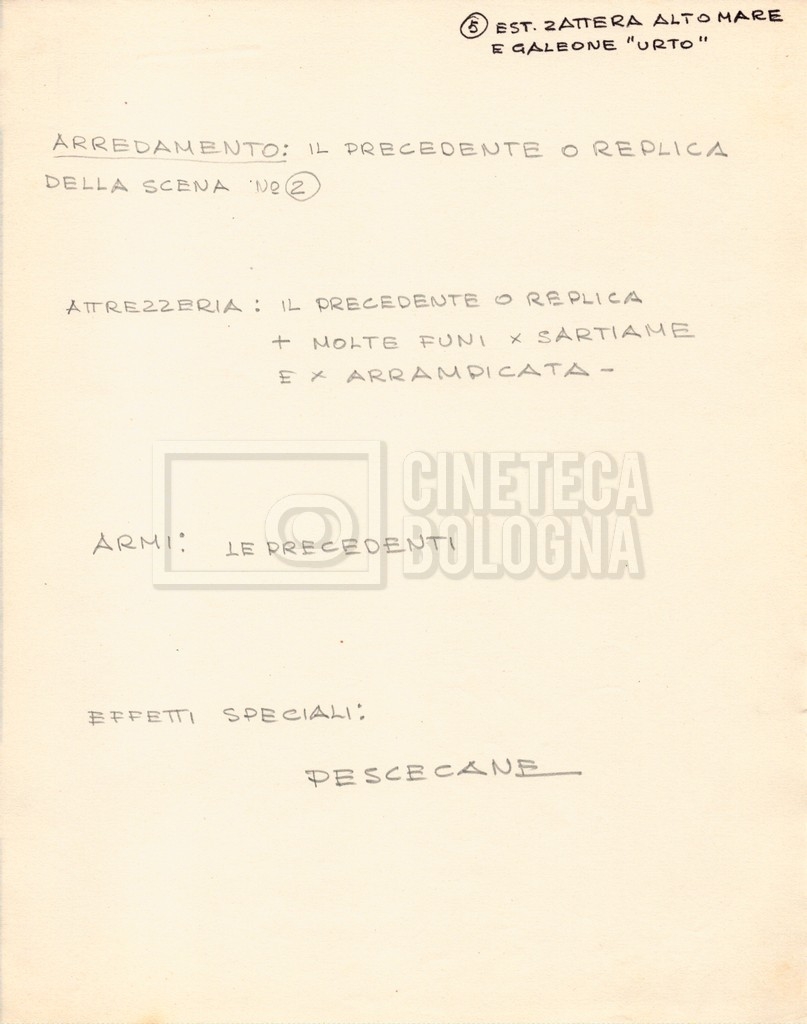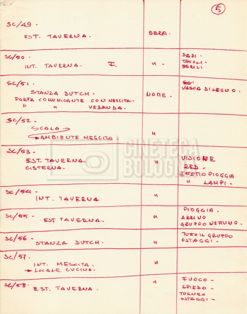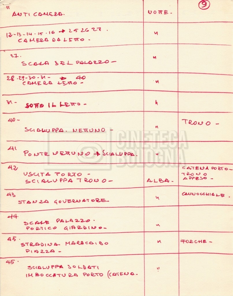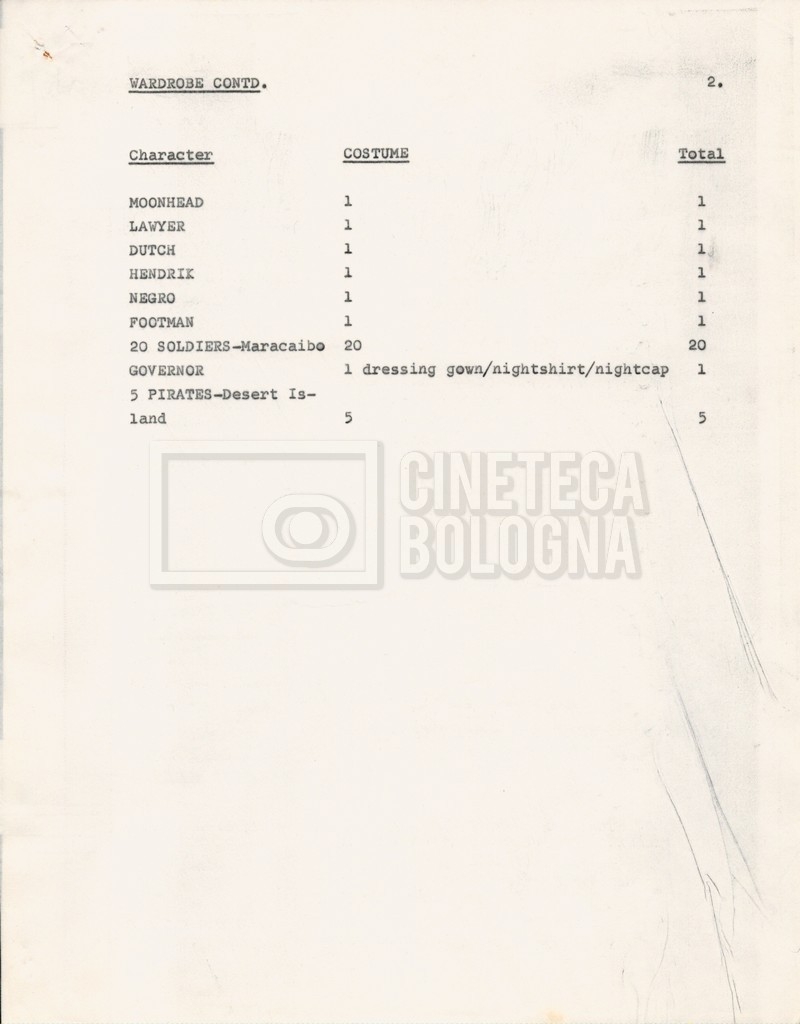– Diverse liste di ambienti interni ed esterni, costumi, oggettistica, armi e dal cast, datt. e mss.;