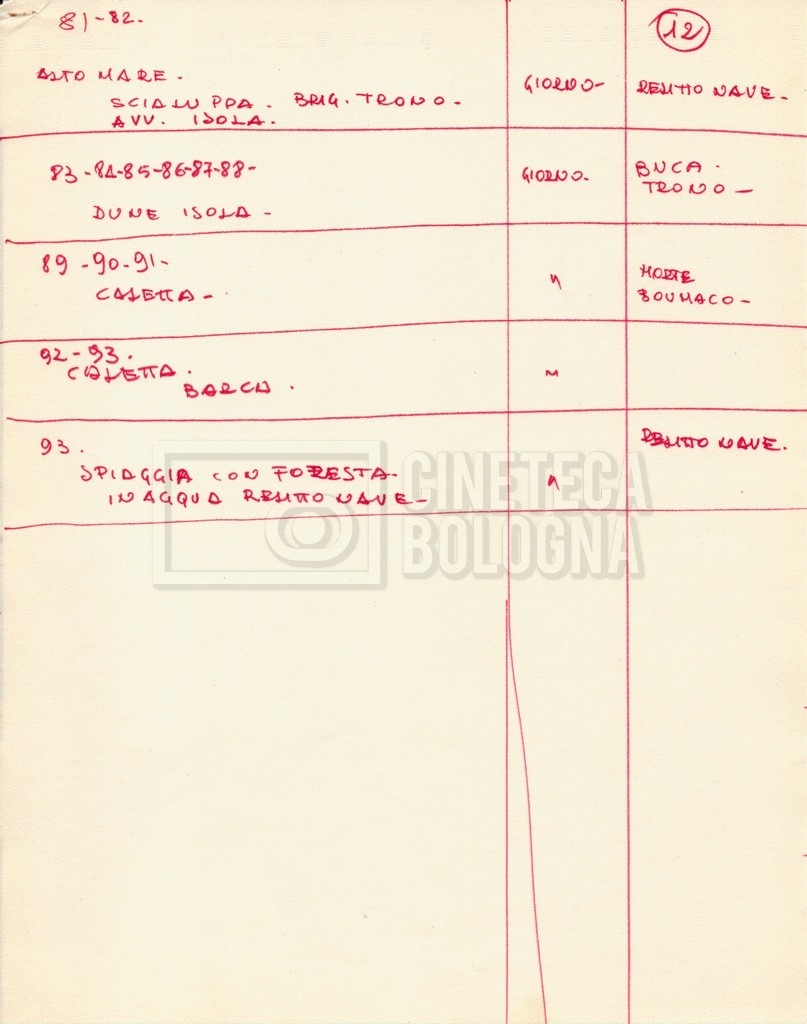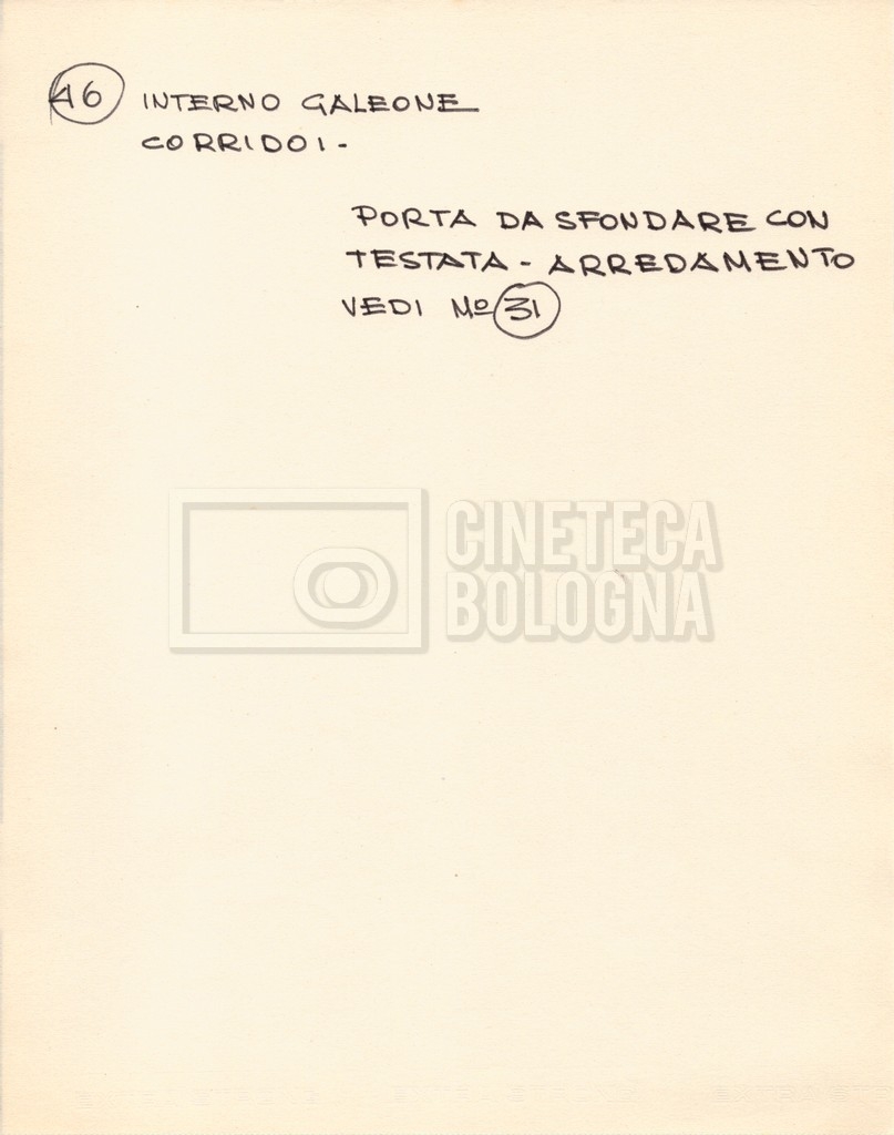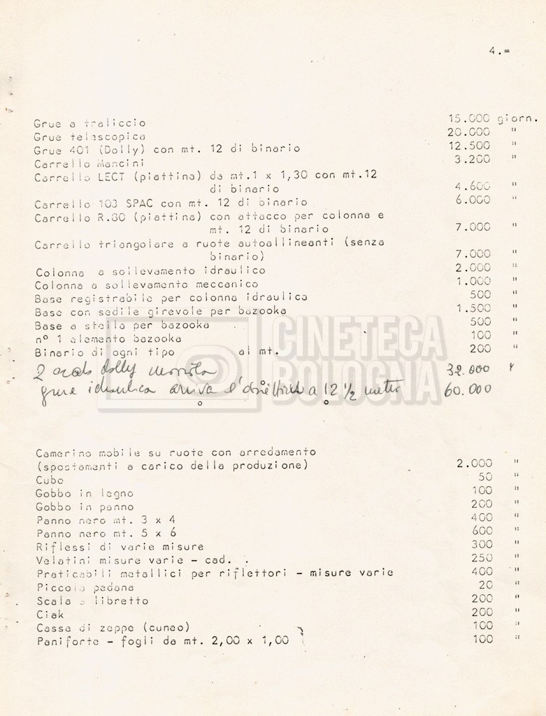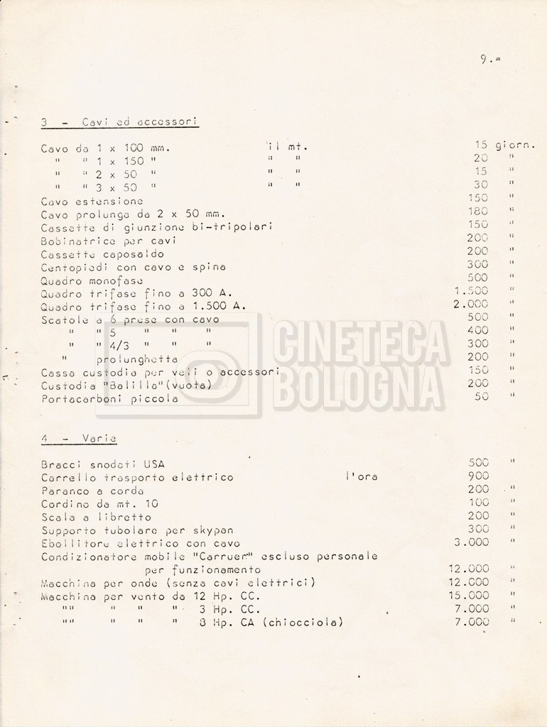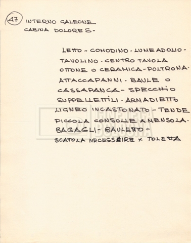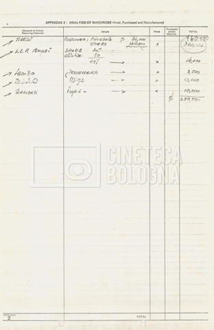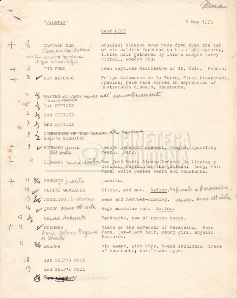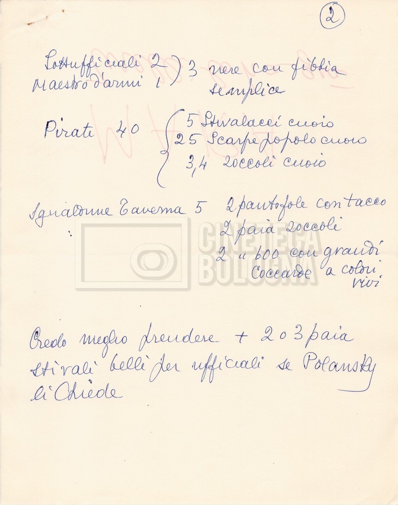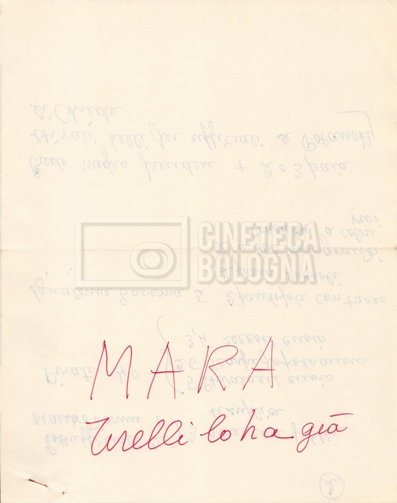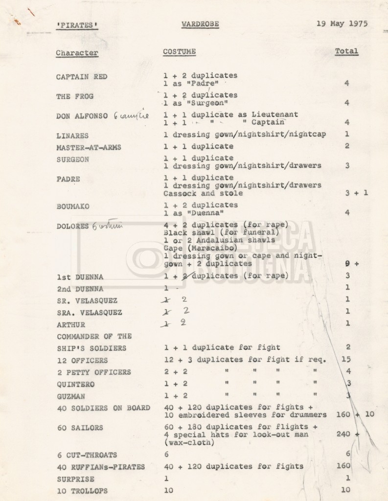 – Diverse liste di ambienti interni ed esterni, costumi, oggettistica, armi e dal cast, datt. e mss.;