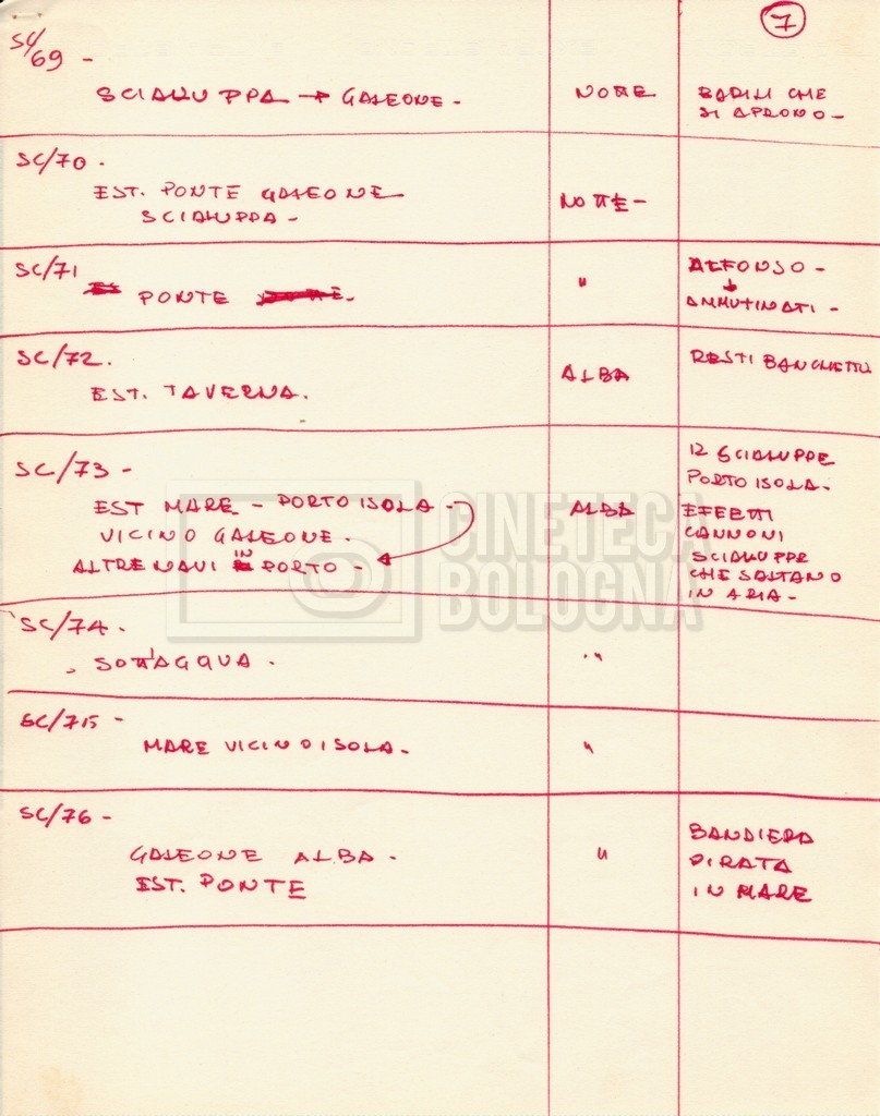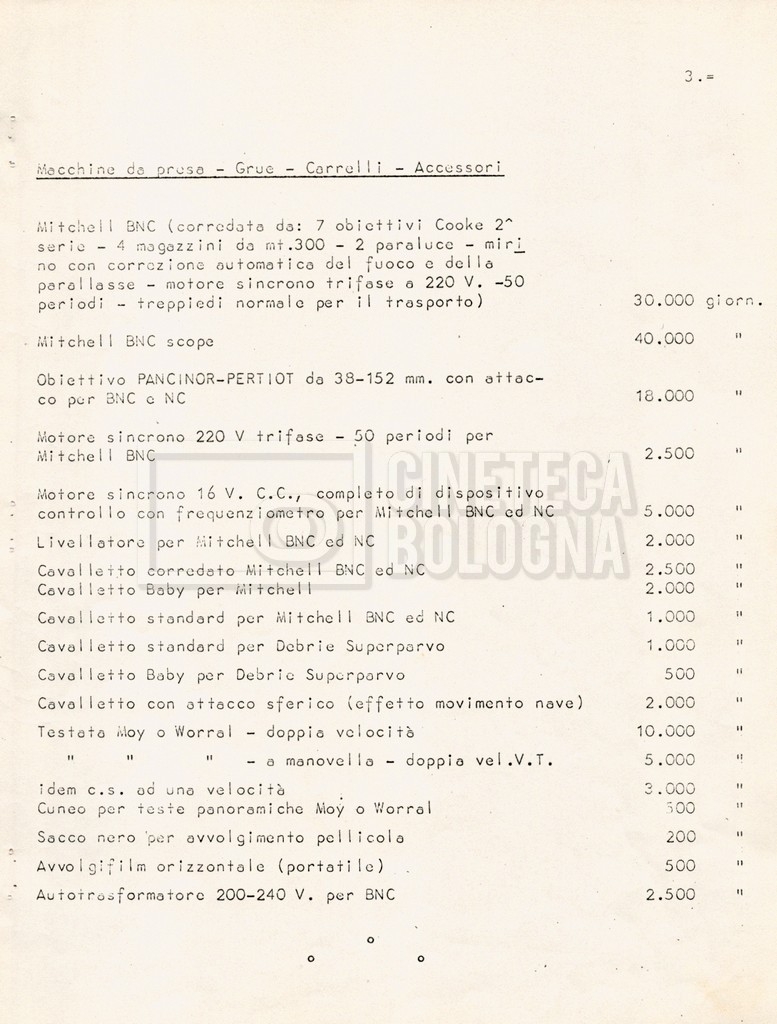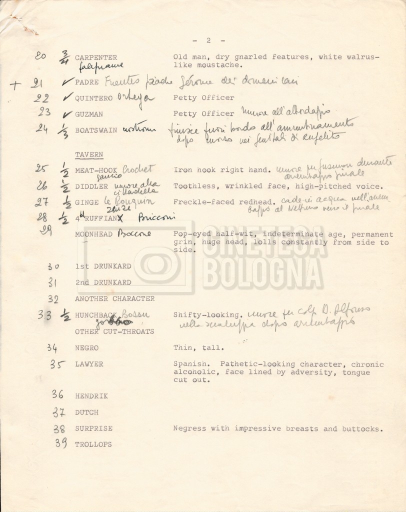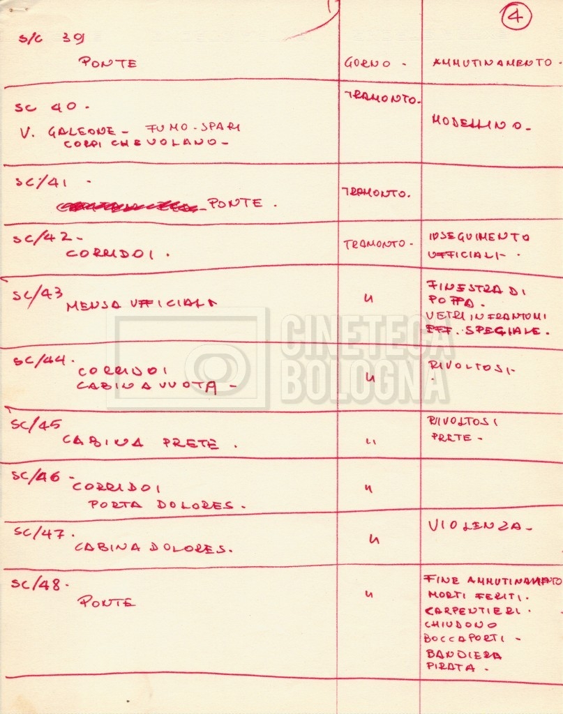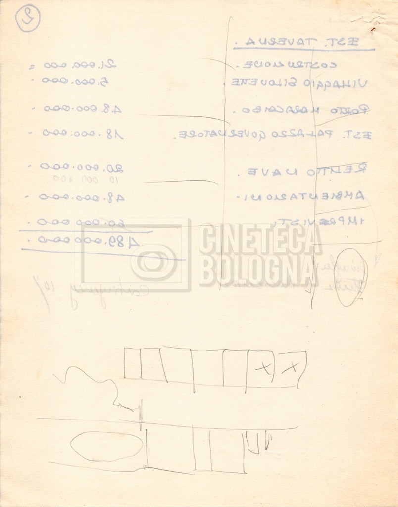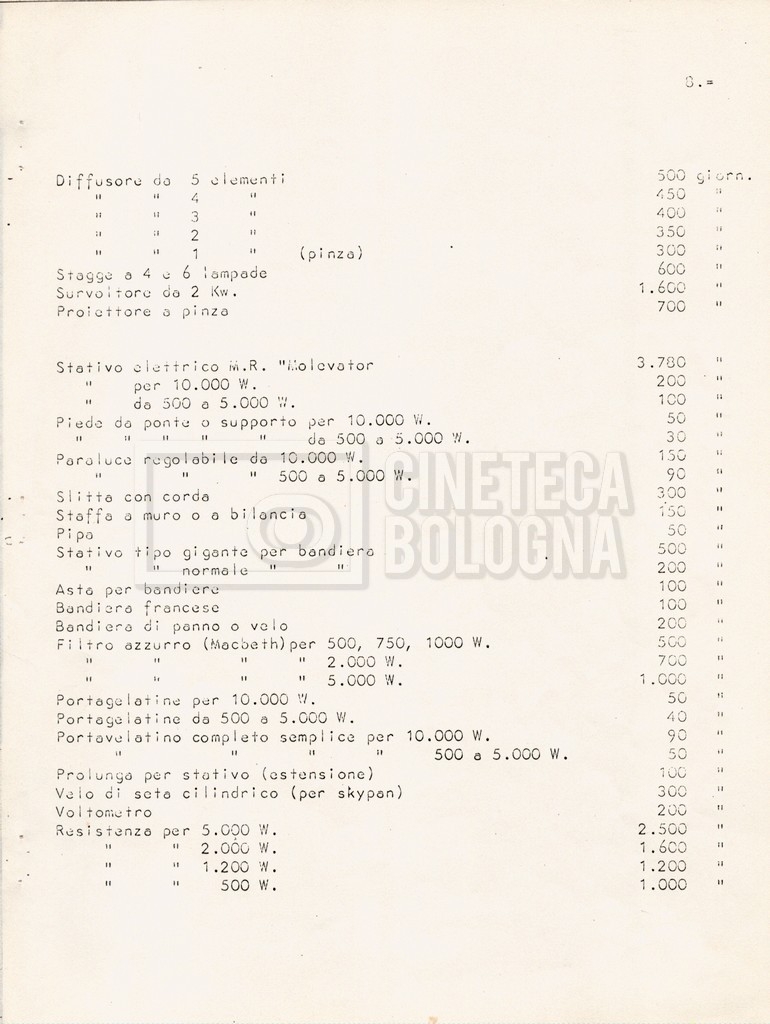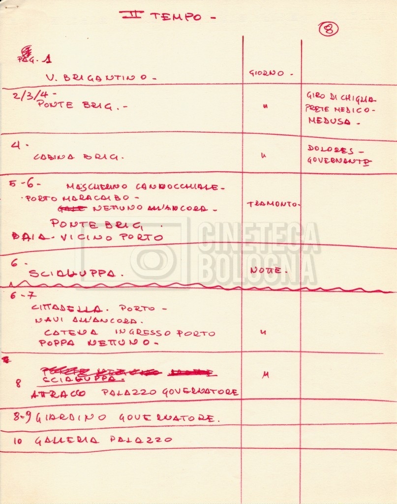 – Diverse liste di ambienti interni ed esterni, costumi, oggettistica, armi e dal cast, datt. e mss.;