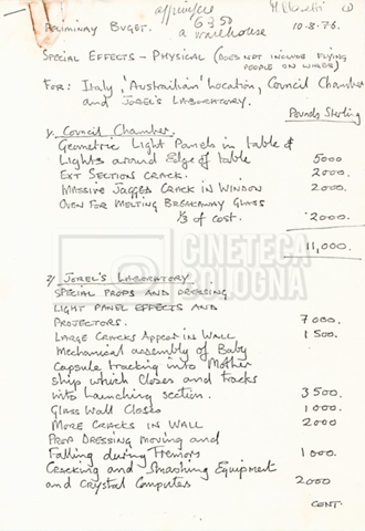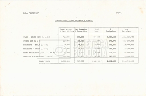 – Un construction and props estimate al 6 agosto 1976;