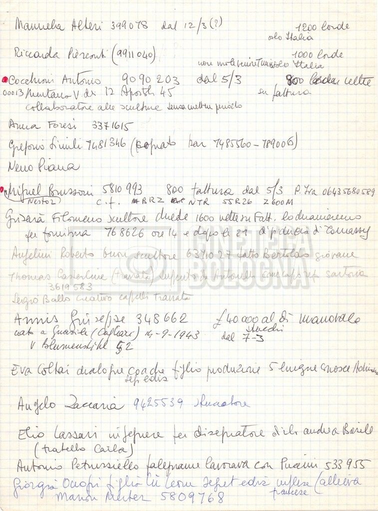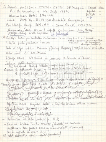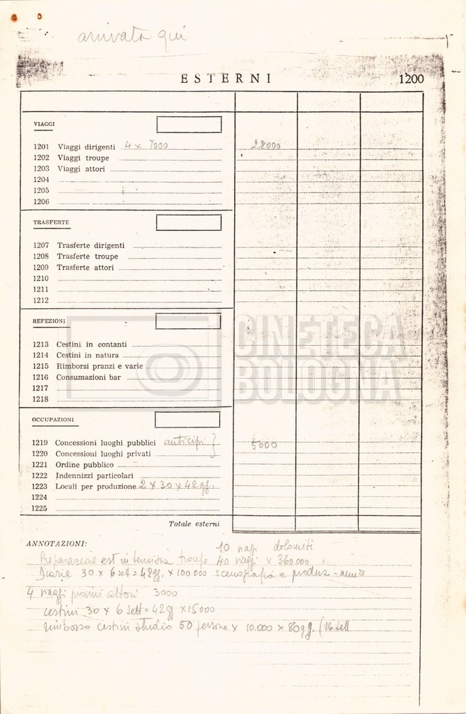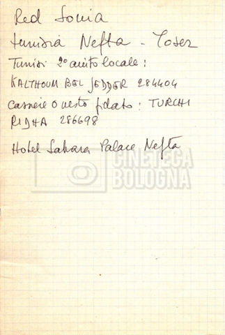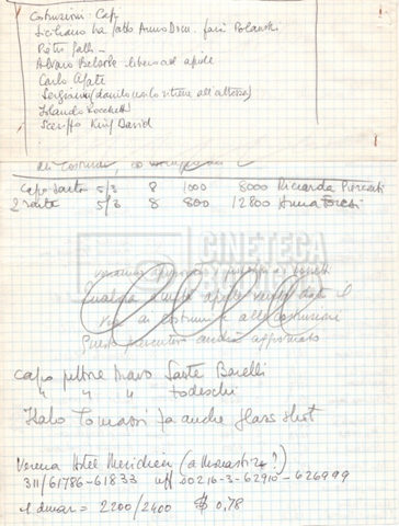 – Appunti mss. con indicazioni su budget, personale tecnico, sopralluoghi e location (Venezia, Tunisia) per il film;
