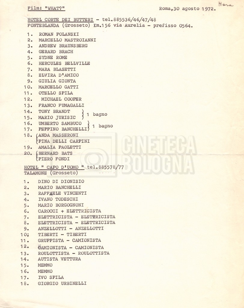 – Un elenco del personale alloggiato nei diversi hotel (30 agosto 1972);