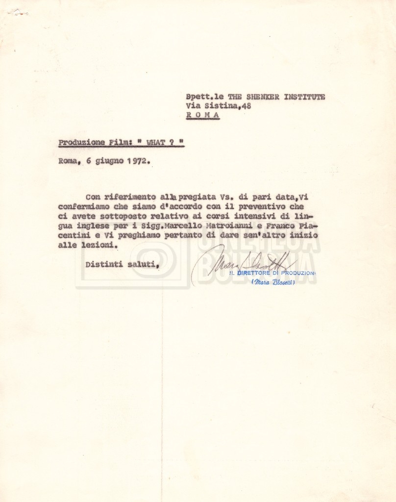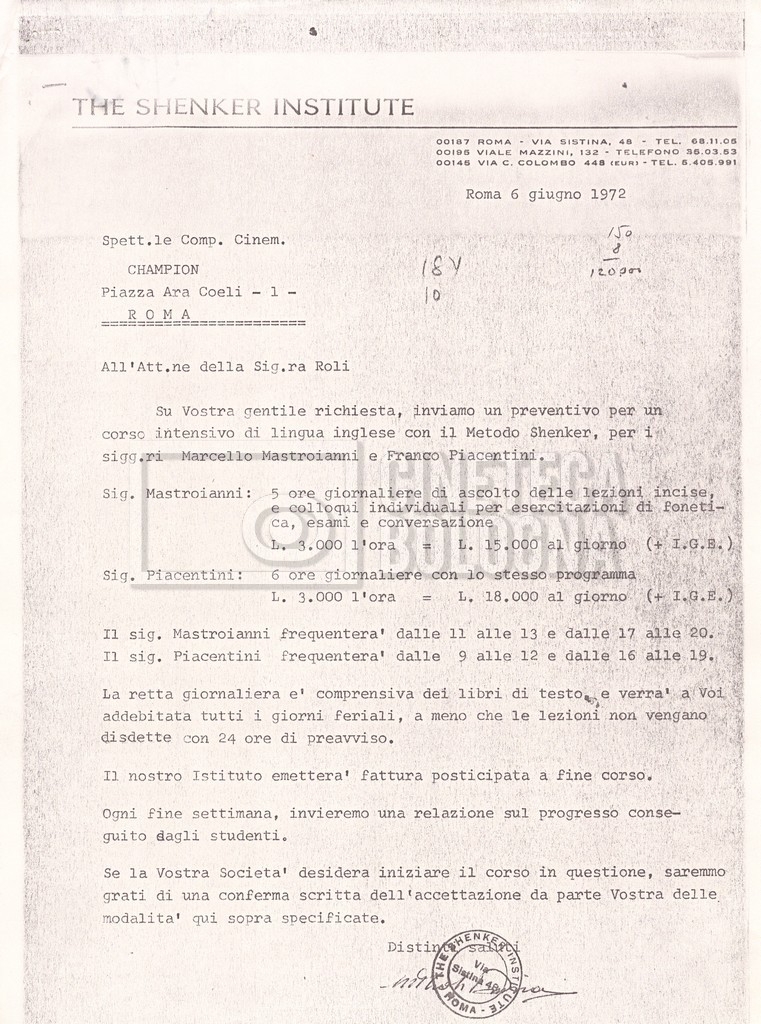 – Corrispondenza tra Mara Blasetti e l”Istituto Shenker’ riguardante le lezioni di inglese per Marcello Mastroianni e Gianfranco Piacentini (6 giugno 1972);