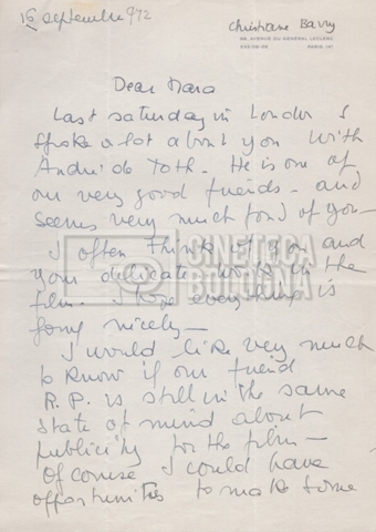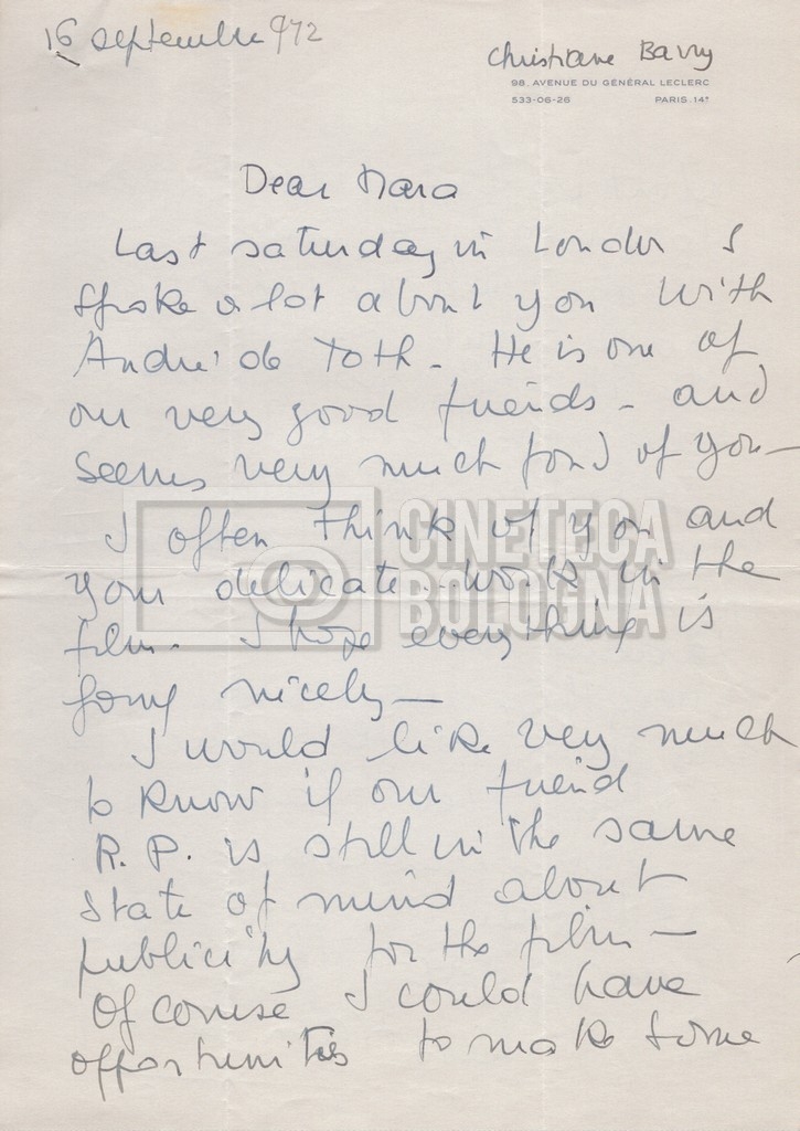 – Una lettera di Christiane Barry (16 settembre 1972);
