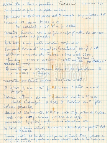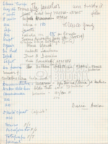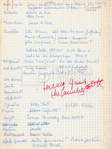 – Diversi appunti mss. tra cui si segnalano tre elenchi del cast artistico e tecnico, un elenco di location e set per riprese in interno e in esterno, due programmi delle riprese in interno e in esterno, un elenco dei veicoli;