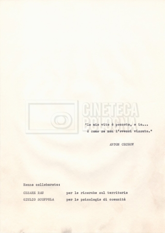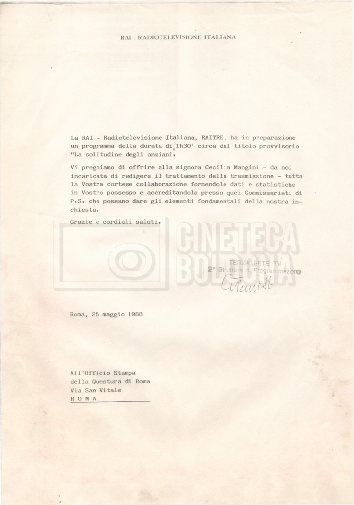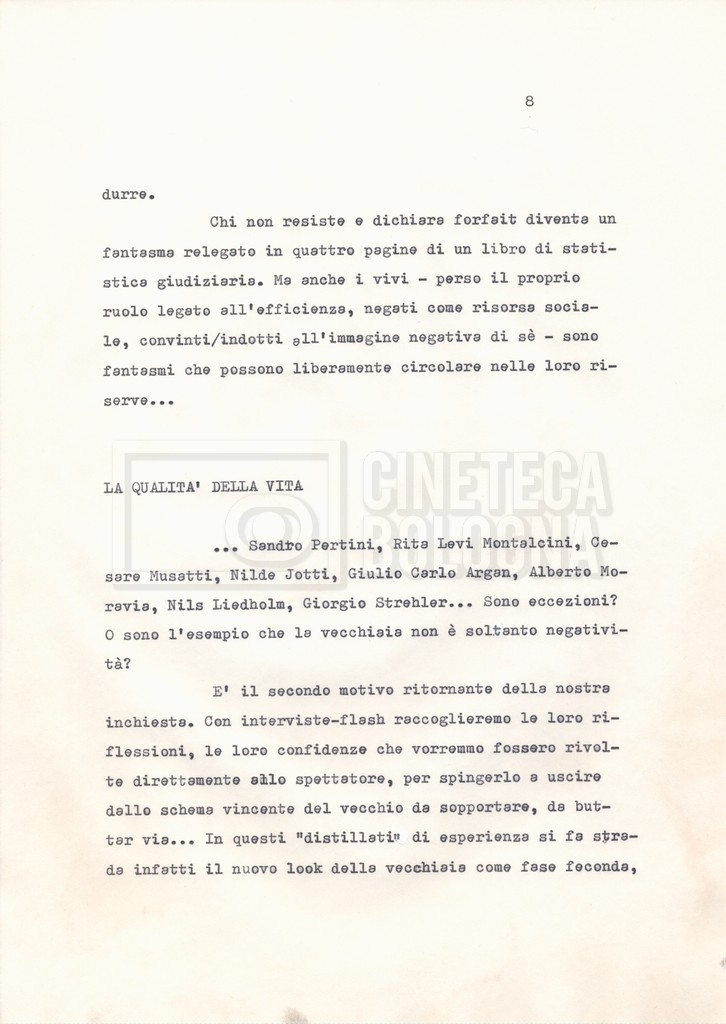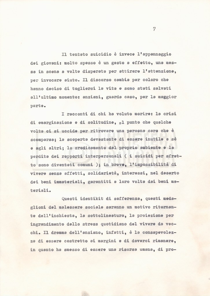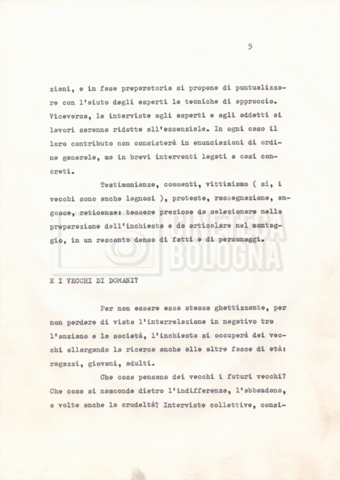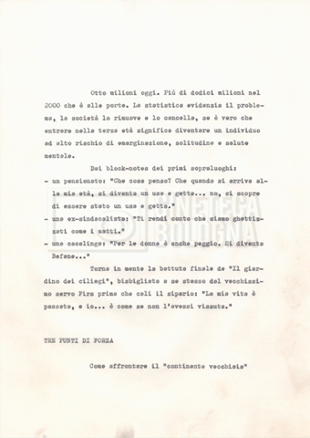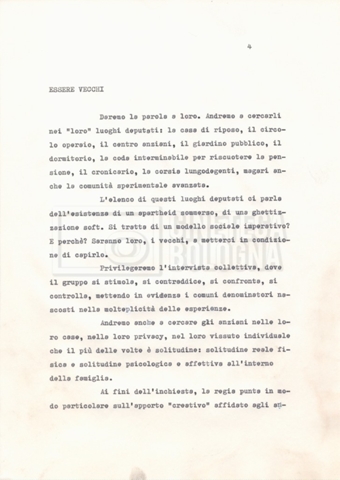 Torna alla banca dati Materiale di studio, corrispondenza e trattamento Documento storico Fondo Cecilia Mangini – Lino Del Fra / “Documentari non realizzati” / “La solitudine degli anziani” Ambiti e contenuto Contiene i s.fascc.:– “Il suicidio negli anziani”;– “La legge della regione Lazio”;– “La RAI alla questura di Roma”;– “Il trattamento”. Informazioni archivistiche Cronologia: 1976 – 1988 Numero di ordinamento definitivo: 5.10.4 Numero di ordinamento provvisorio: 49.04 Descrizione fisica: fascicolo Immagini digitalizzate Documenti correlati Vai alla banca dati DOCUMENTO STORICO “Rassegna stampa” DOCUMENTO STORICO “Fotocopie” DOCUMENTO STORICO Appunti DOCUMENTO STORICO Materiale di studio
