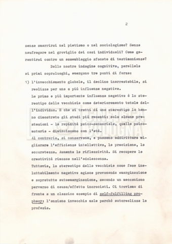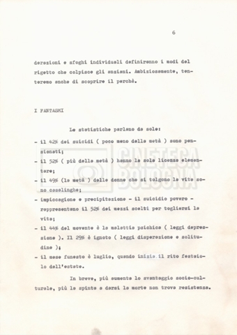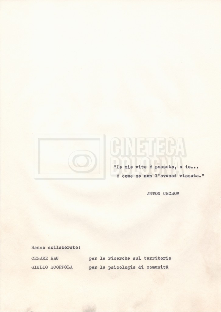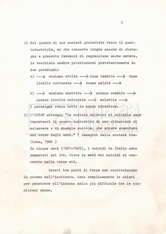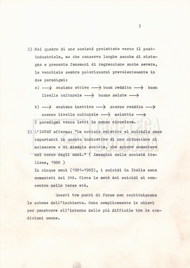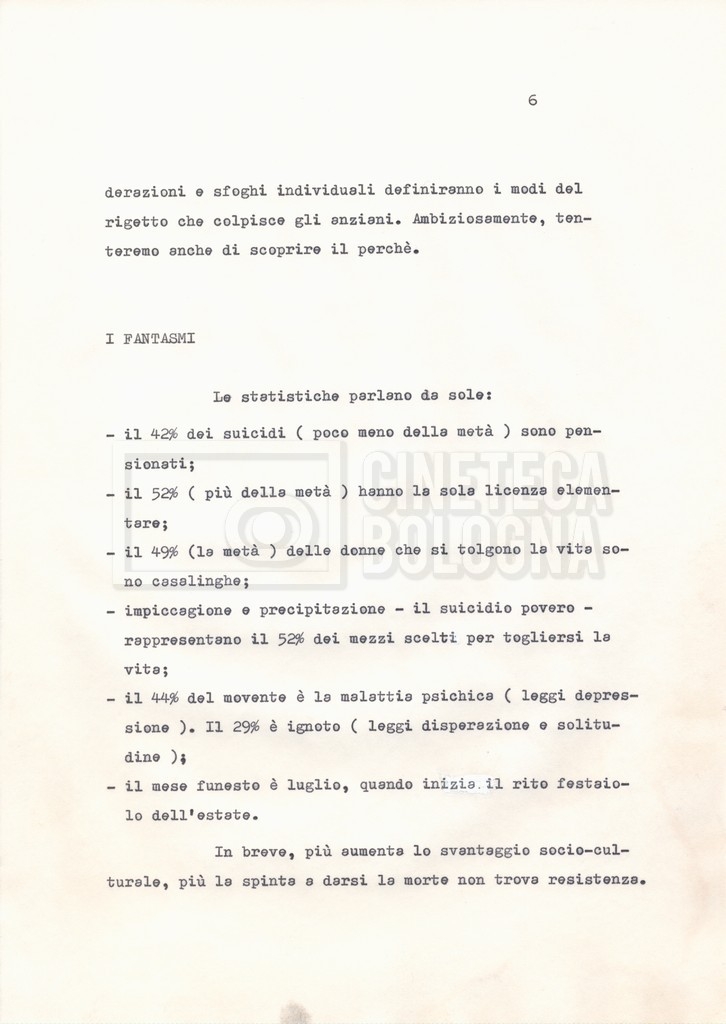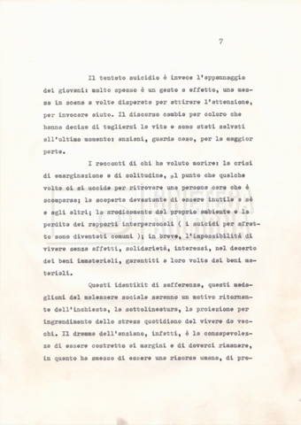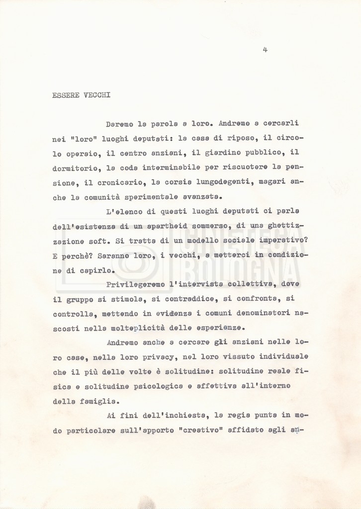 Torna alla banca dati Materiale di studio, corrispondenza e trattamento Documento storico Fondo Cecilia Mangini – Lino Del Fra / “Documentari non realizzati” / “La solitudine degli anziani” Ambiti e contenuto Contiene i s.fascc.:– “Il suicidio negli anziani”;– “La legge della regione Lazio”;– “La RAI alla questura di Roma”;– “Il trattamento”. Informazioni archivistiche Cronologia: 1976 – 1988 Numero di ordinamento definitivo: 5.10.4 Numero di ordinamento provvisorio: 49.04 Descrizione fisica: fascicolo Immagini digitalizzate Documenti correlati Vai alla banca dati DOCUMENTO STORICO “Rassegna stampa” DOCUMENTO STORICO “Fotocopie” DOCUMENTO STORICO Appunti DOCUMENTO STORICO Materiale di studio