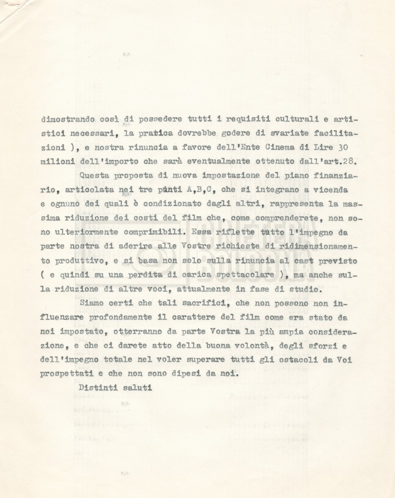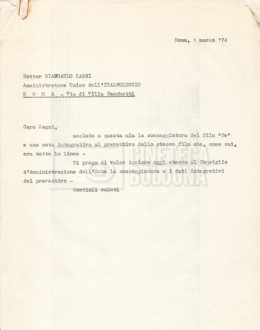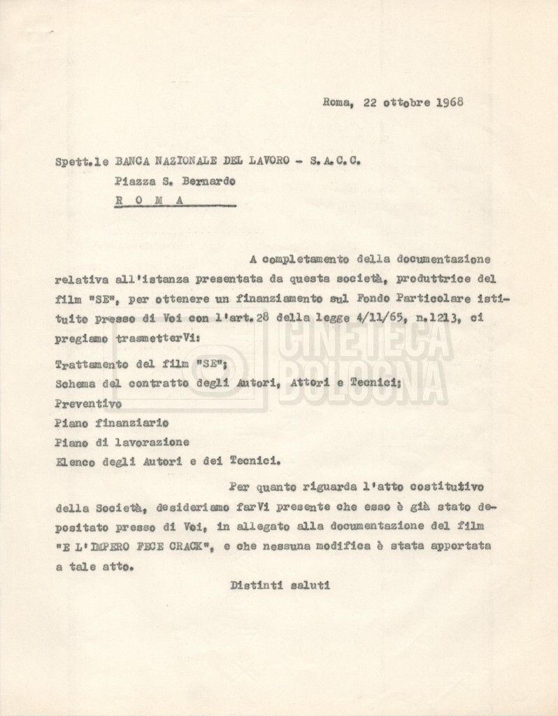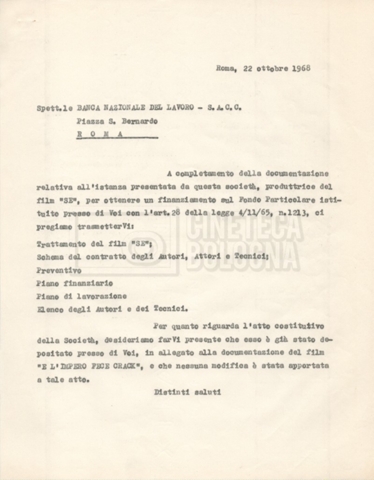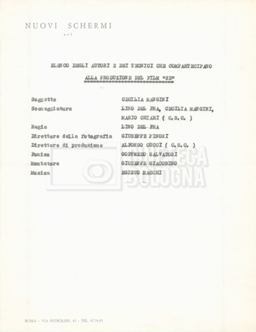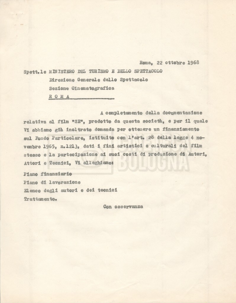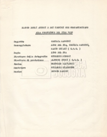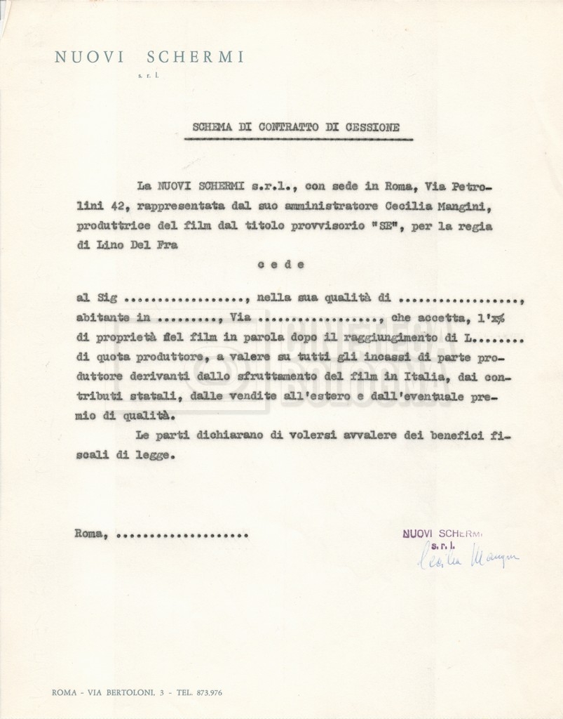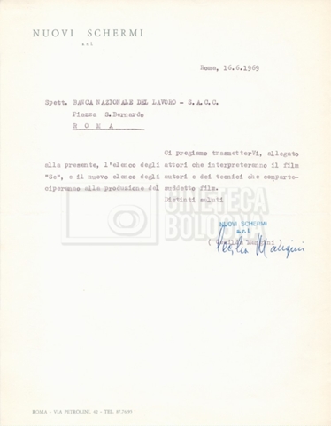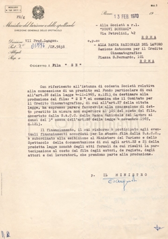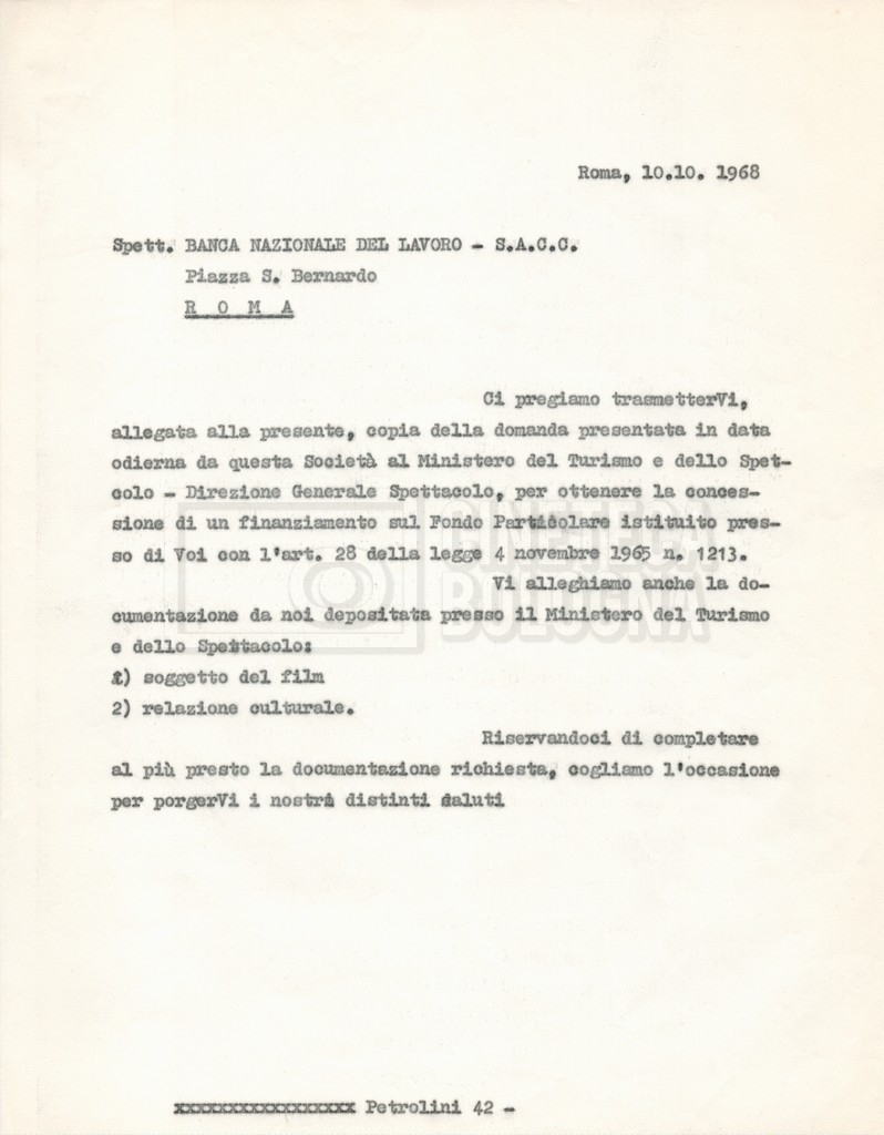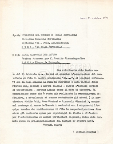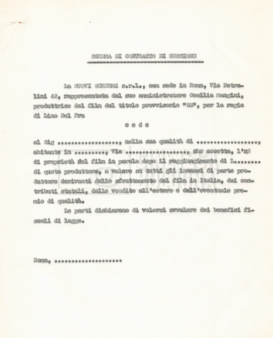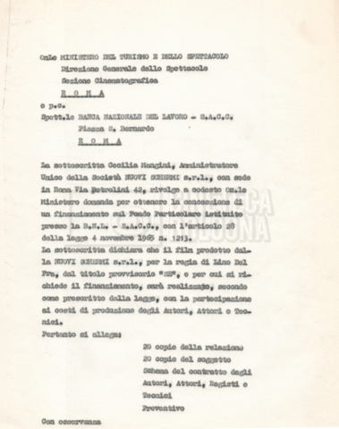 – ‘Corrispondenza’: contiene lettere di invio di documenti, una richiesta finanziamento e uno schema di contratto di cessione al ‘Ministero dello Spettacolo’ e alla ‘Banca Nazionale del Lavoro’;