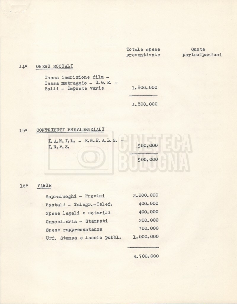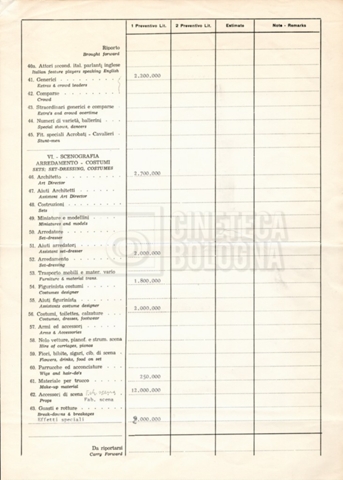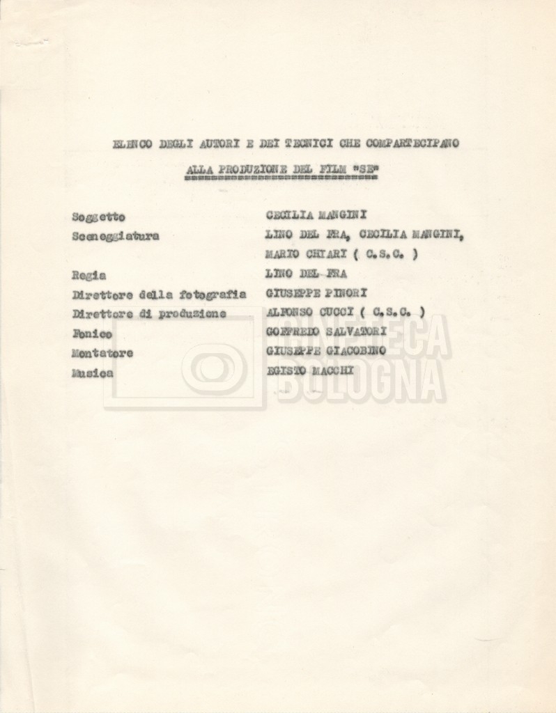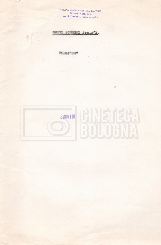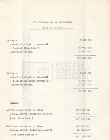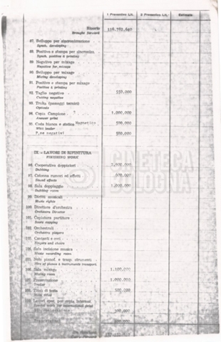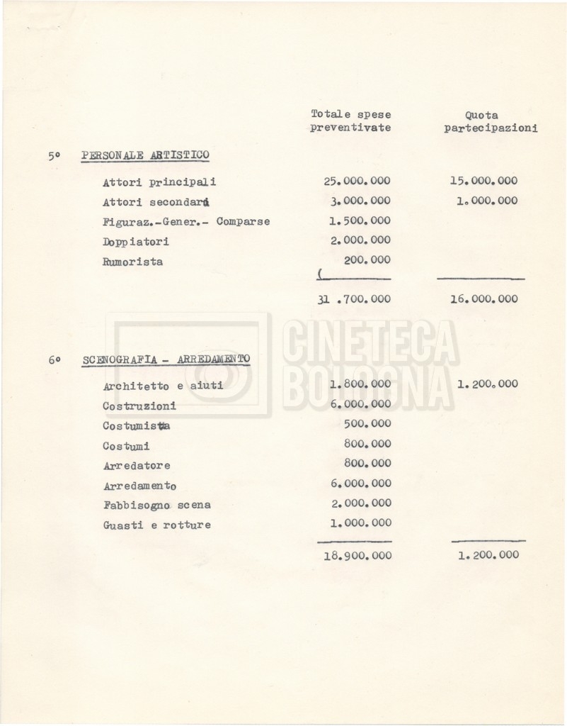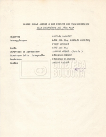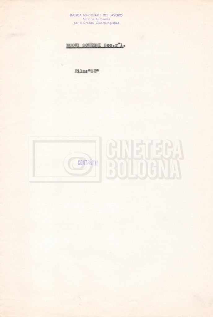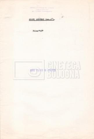 – ‘Documenti per la Banca Nazionale del Lavoro’: contiene elenchi di attori, autori e tecnici; il soggetto; il piano tecnico e artistico; i piani di lavorazione; un preventivo di costo; uno schema di contratto di cessione;