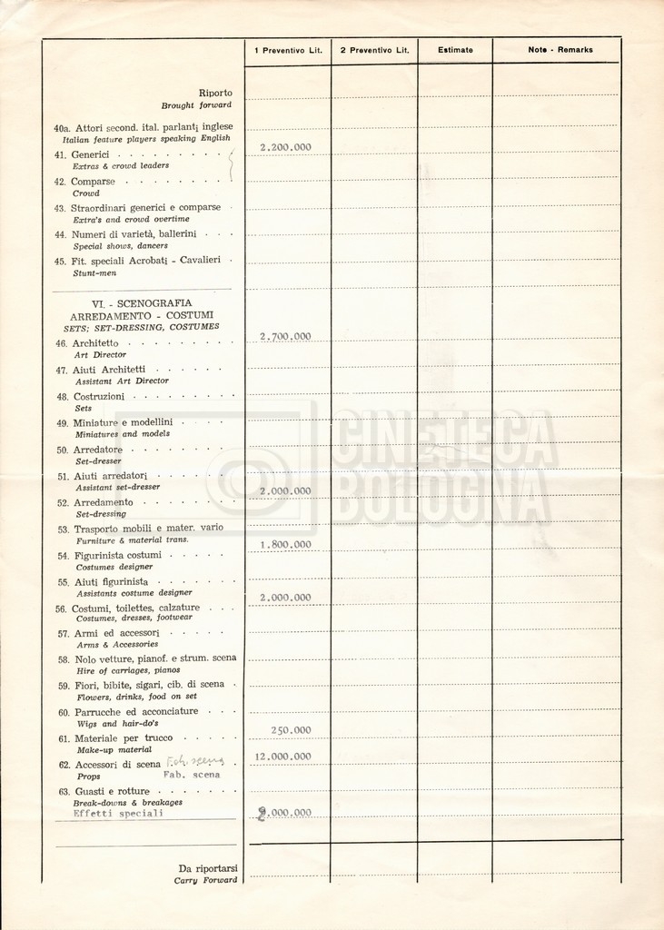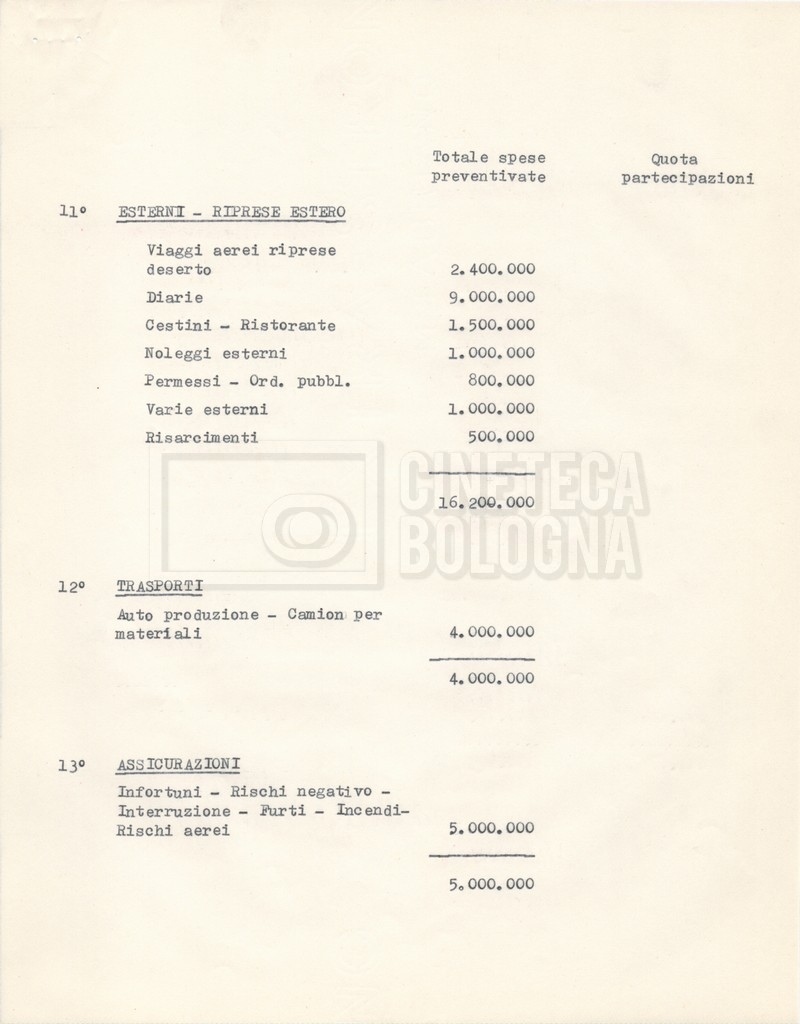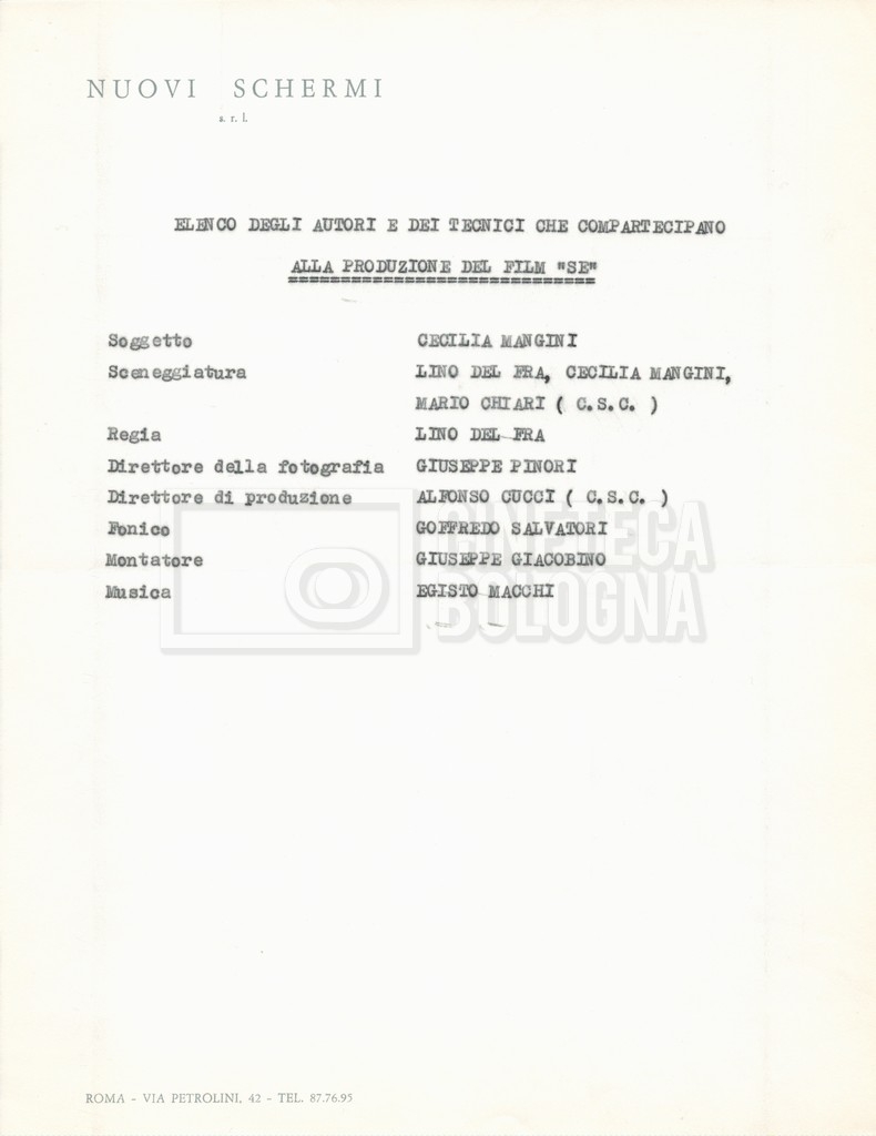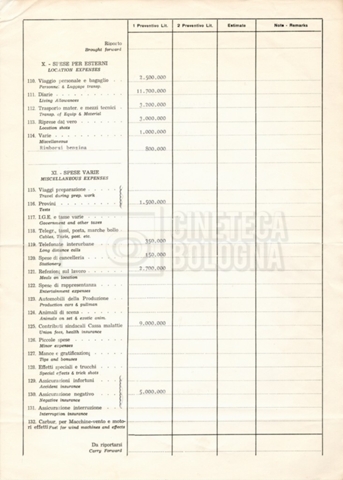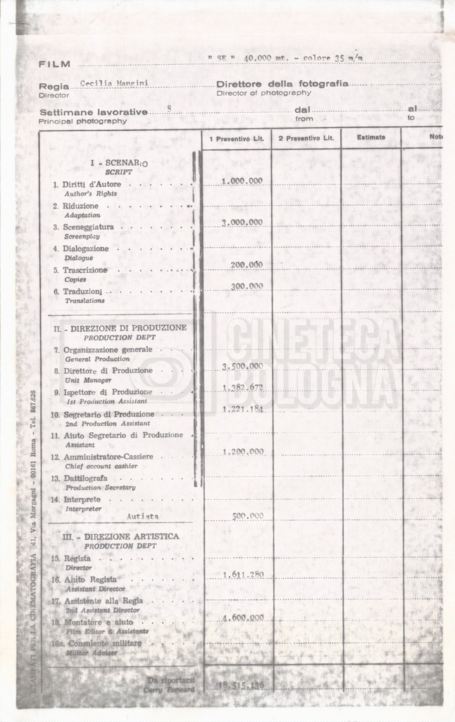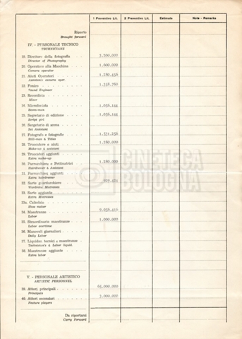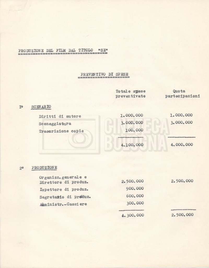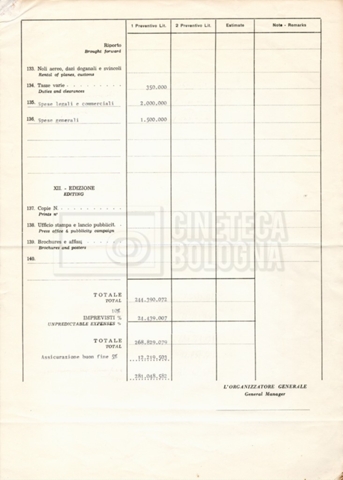 – ‘Documenti per la Banca Nazionale del Lavoro’: contiene elenchi di attori, autori e tecnici; il soggetto; il piano tecnico e artistico; i piani di lavorazione; un preventivo di costo; uno schema di contratto di cessione;