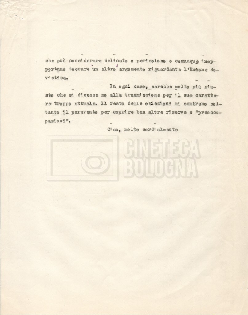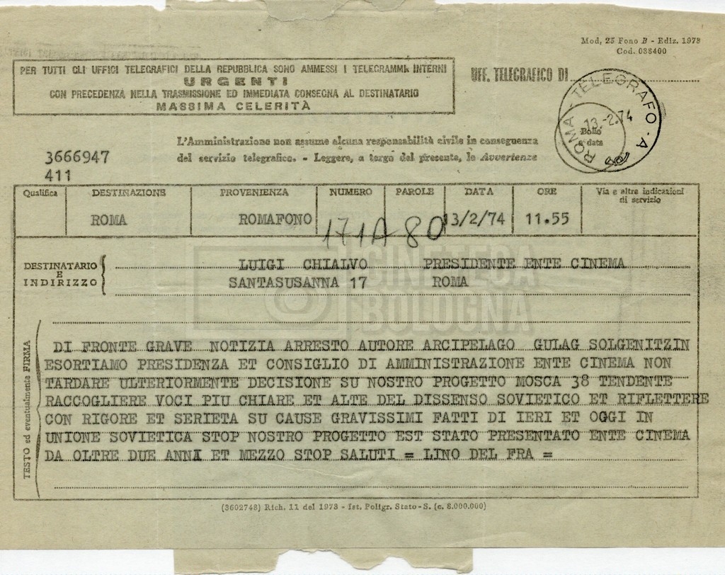 – Un telegramma di Lino Del Fra a Luigi Chialvo in merito all’arresto di Aleksandr Solenicyn;