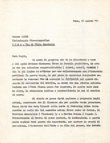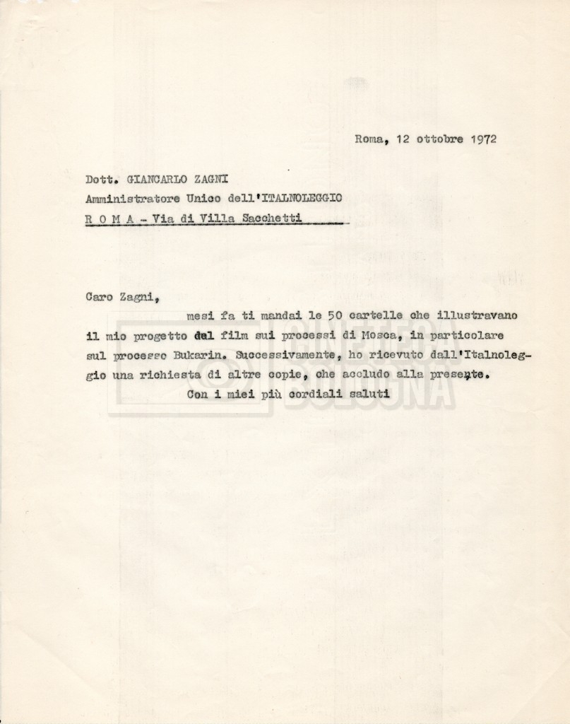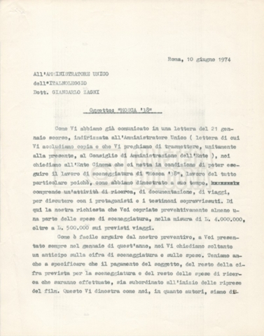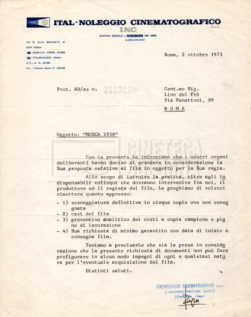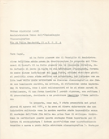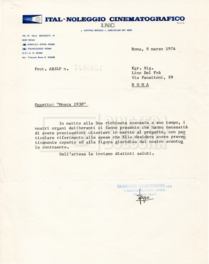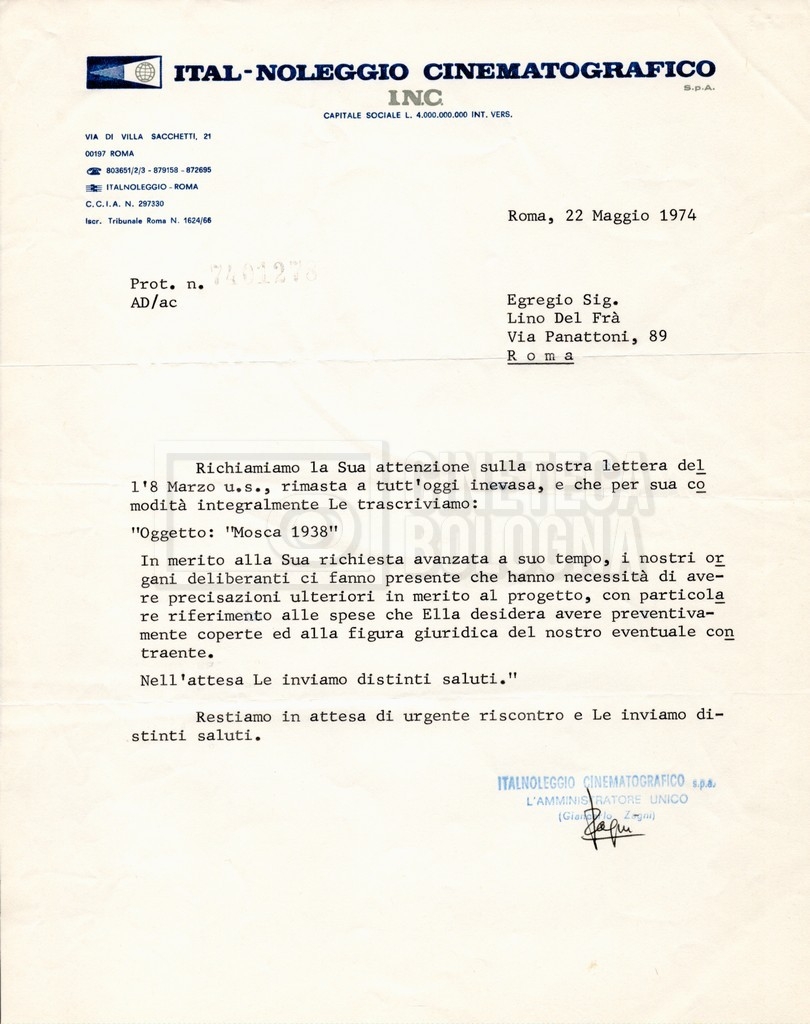 – Corrispondenza tra Zagni, direttore della ‘Italnoleggio’, e Lino Del Fra, riguardante una prima versione del progetto;