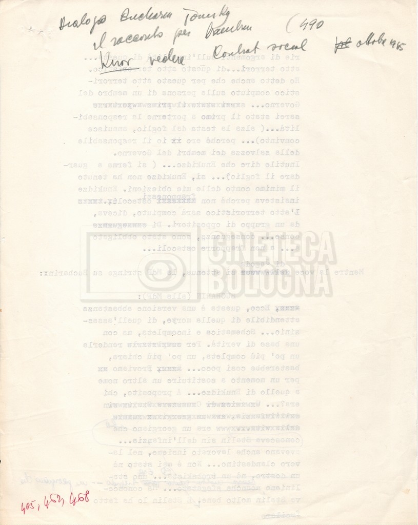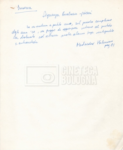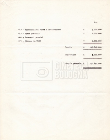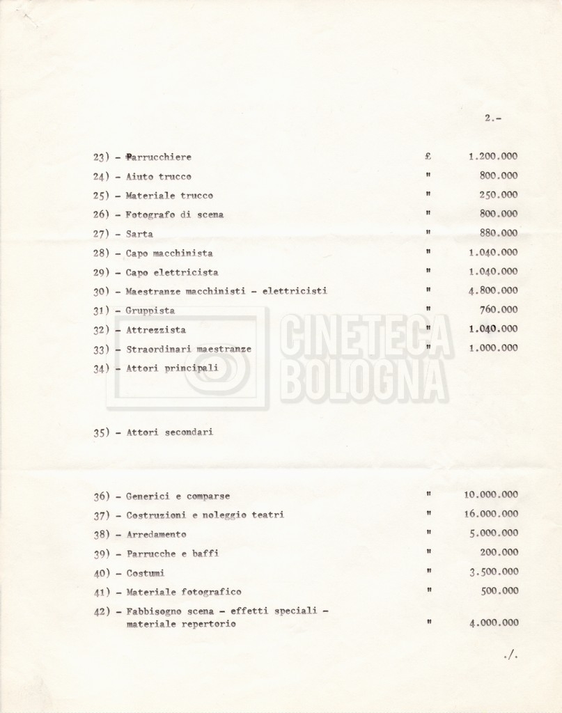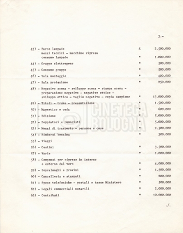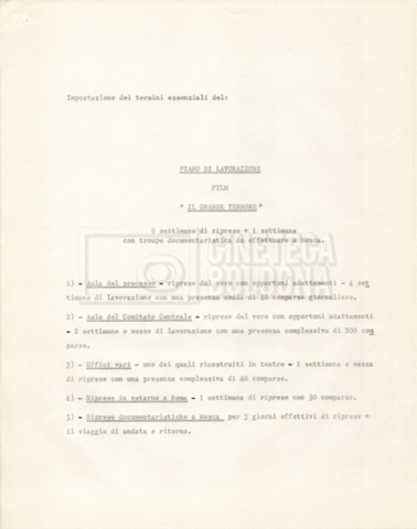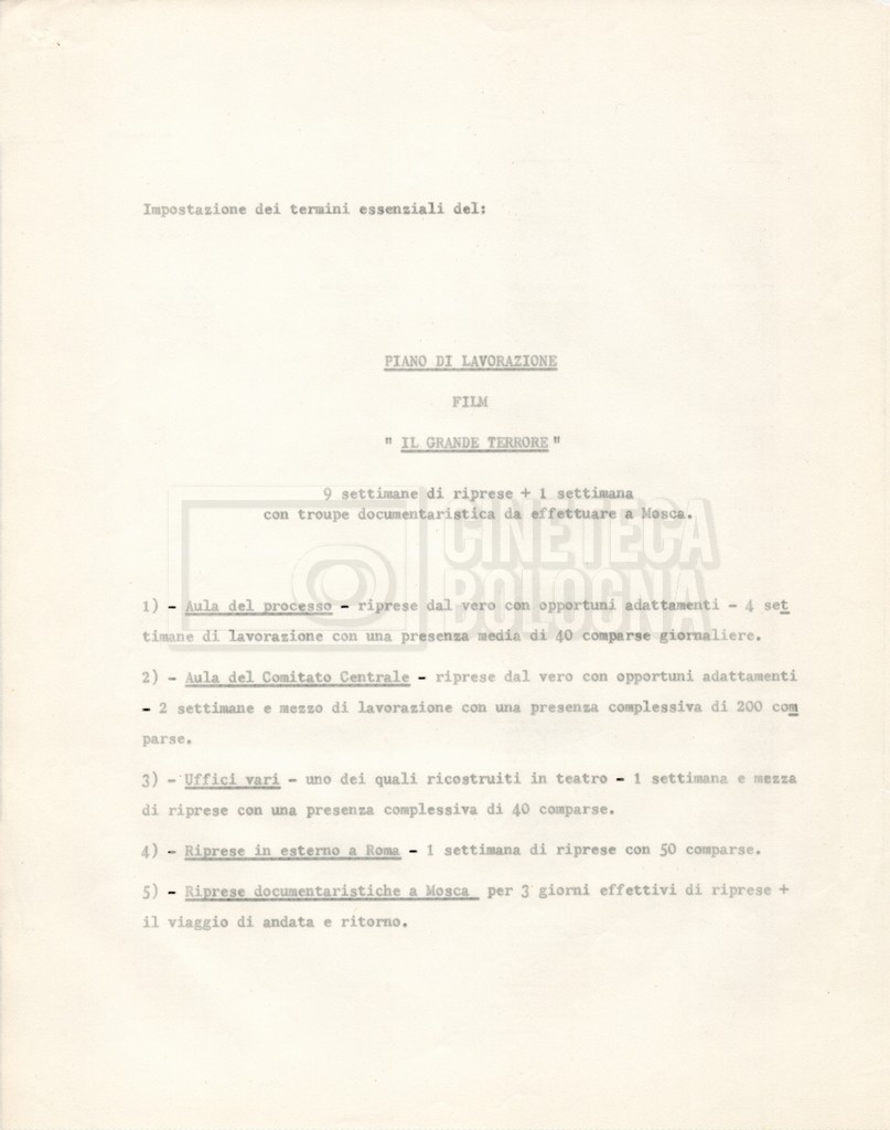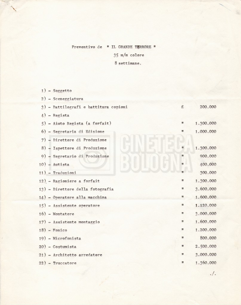 – I termini essenziali del piano di lavorazione e il preventivo de ‘Il grande terrore’, altro titolo del film;