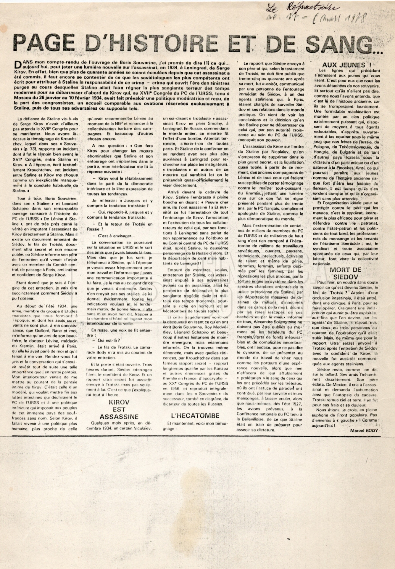 – Un articolo scientifico in fotocopia dal titolo L’affaire Kirov commence en 1934 di Jean P. Joubert (“Cahiers Léon Trotsky”, dicembre 1984, n. 20);