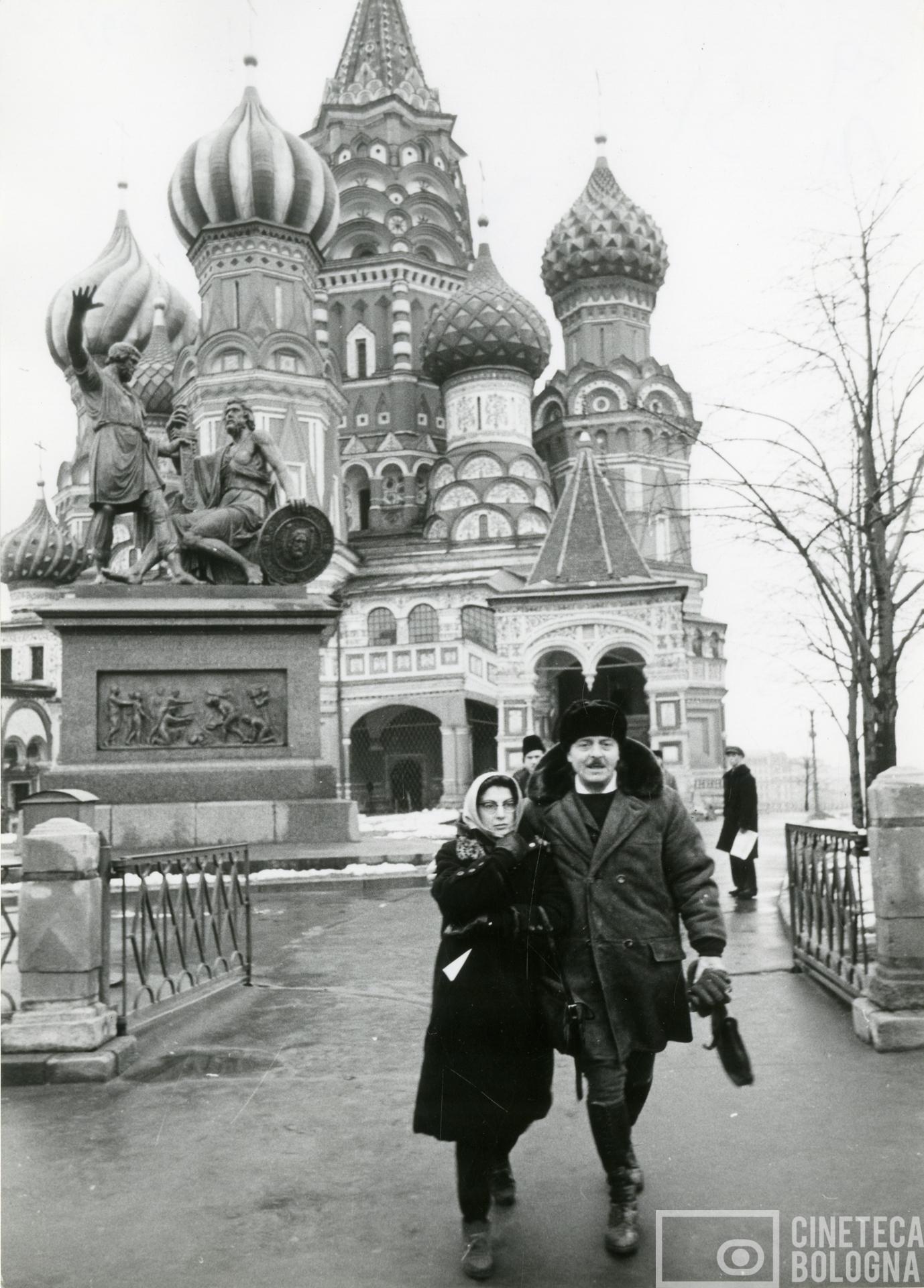 Mosca. Mara Blasetti e Alessandro Blasetti presso la Cattedrale di San Basilio presso la Piazza Rossa durante le riprese del film Io amo, tu ami…