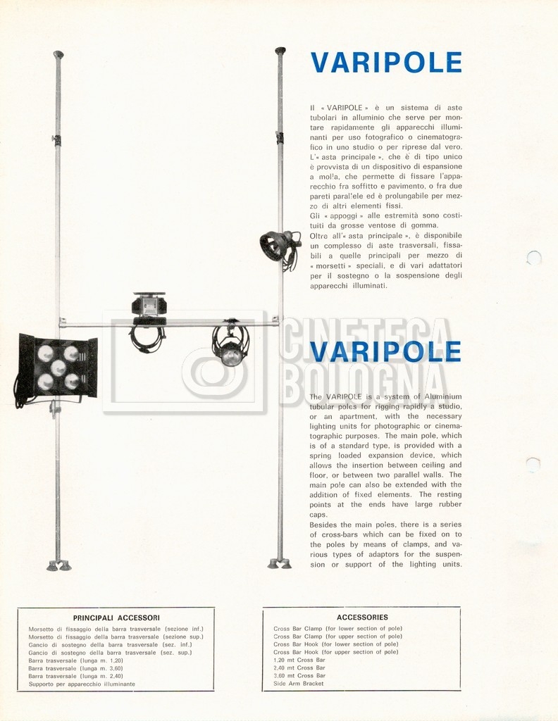 – Dodici cataloghi, sei in italiano e sei in inglese, per forniture di materiale cinematografico della società ‘Ianiro’. I cataloghi in italiano sono suddivisi nelle seguenti categorie per tipologia di materiale: “Sezione ponteggi e praticabili”, “Sezione materiale elettrico”, “Sezione arco”, “Sezione materiale vario”, “Sezione schermi e riflessi”, “Sezione proiettori e diffusori”. Lo stesso vale per quelli in inglese che sono del tutto identici a quelli in italiano, unica differenza è la lingua in cui sono scritti.
