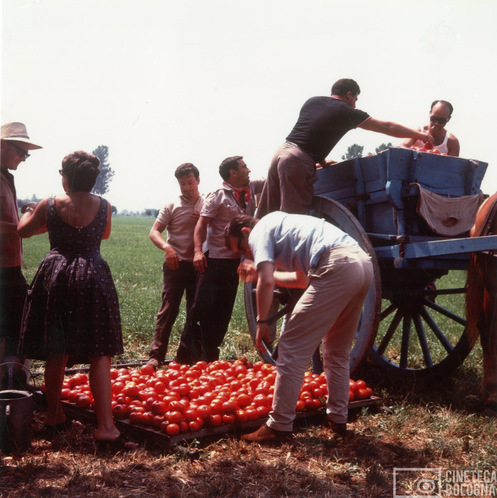 Parma. Mara Blasetti, Frank Worth e altre persone non identificate della troupe durante le riprese di un cortometraggio pubblicitario per la Campbell
