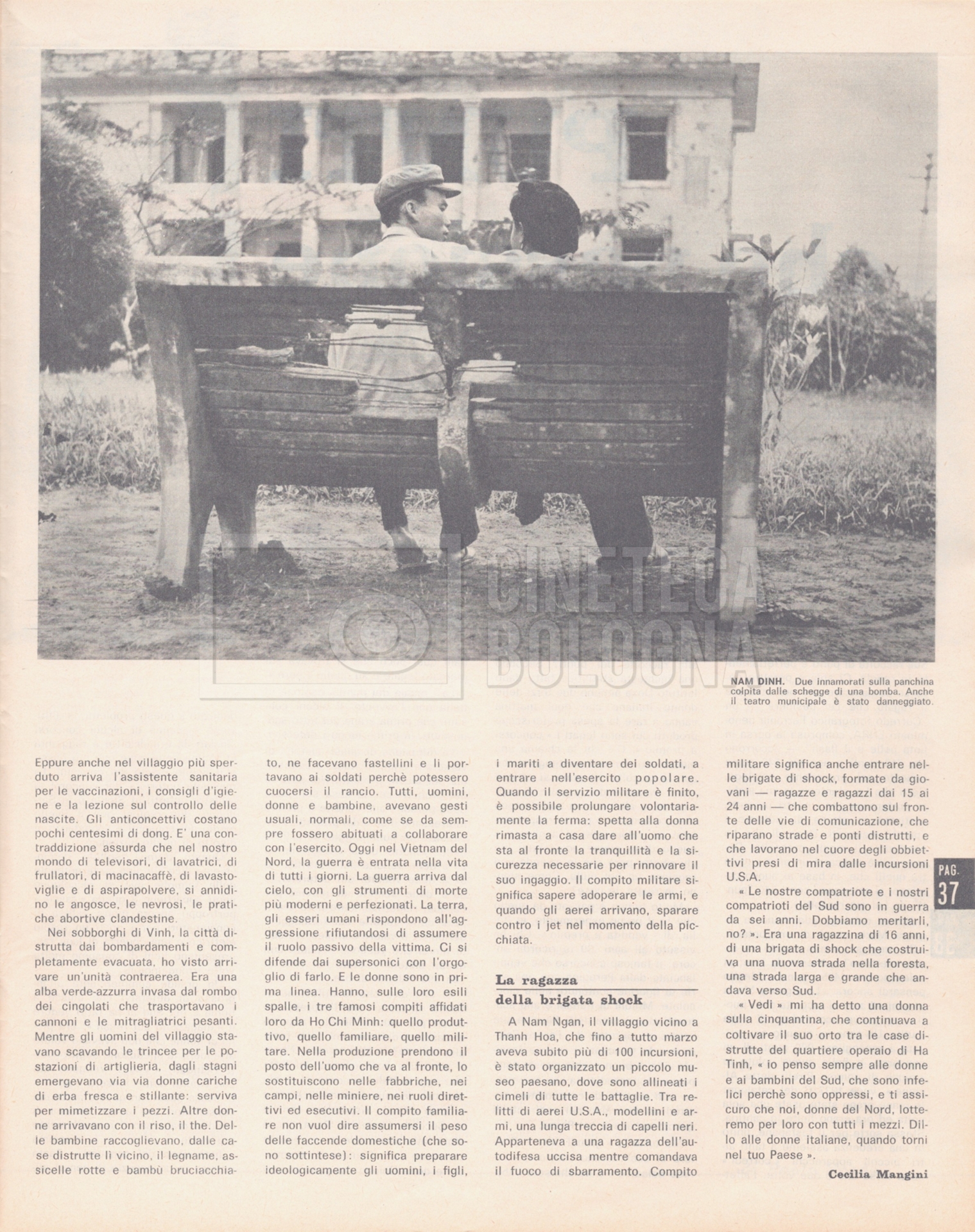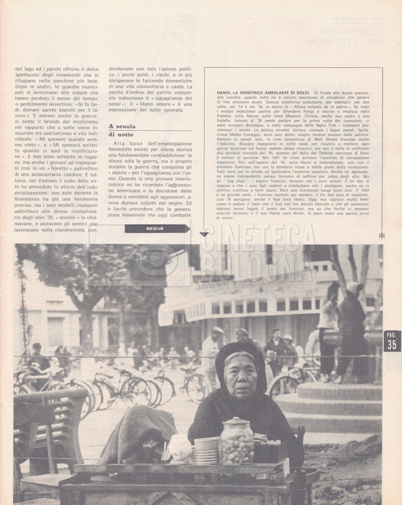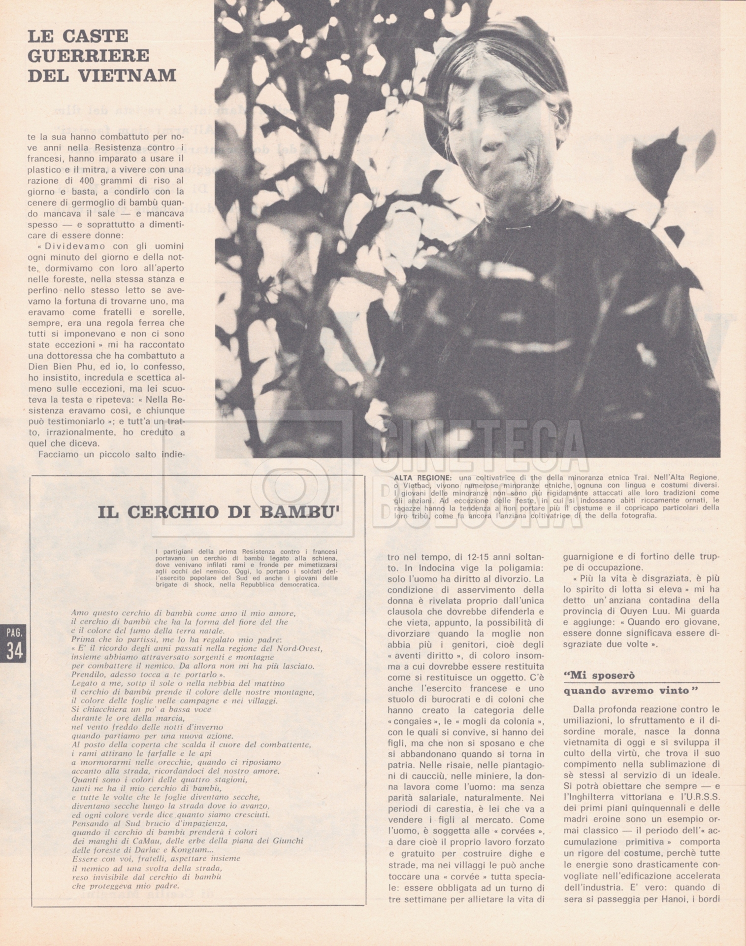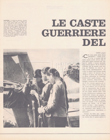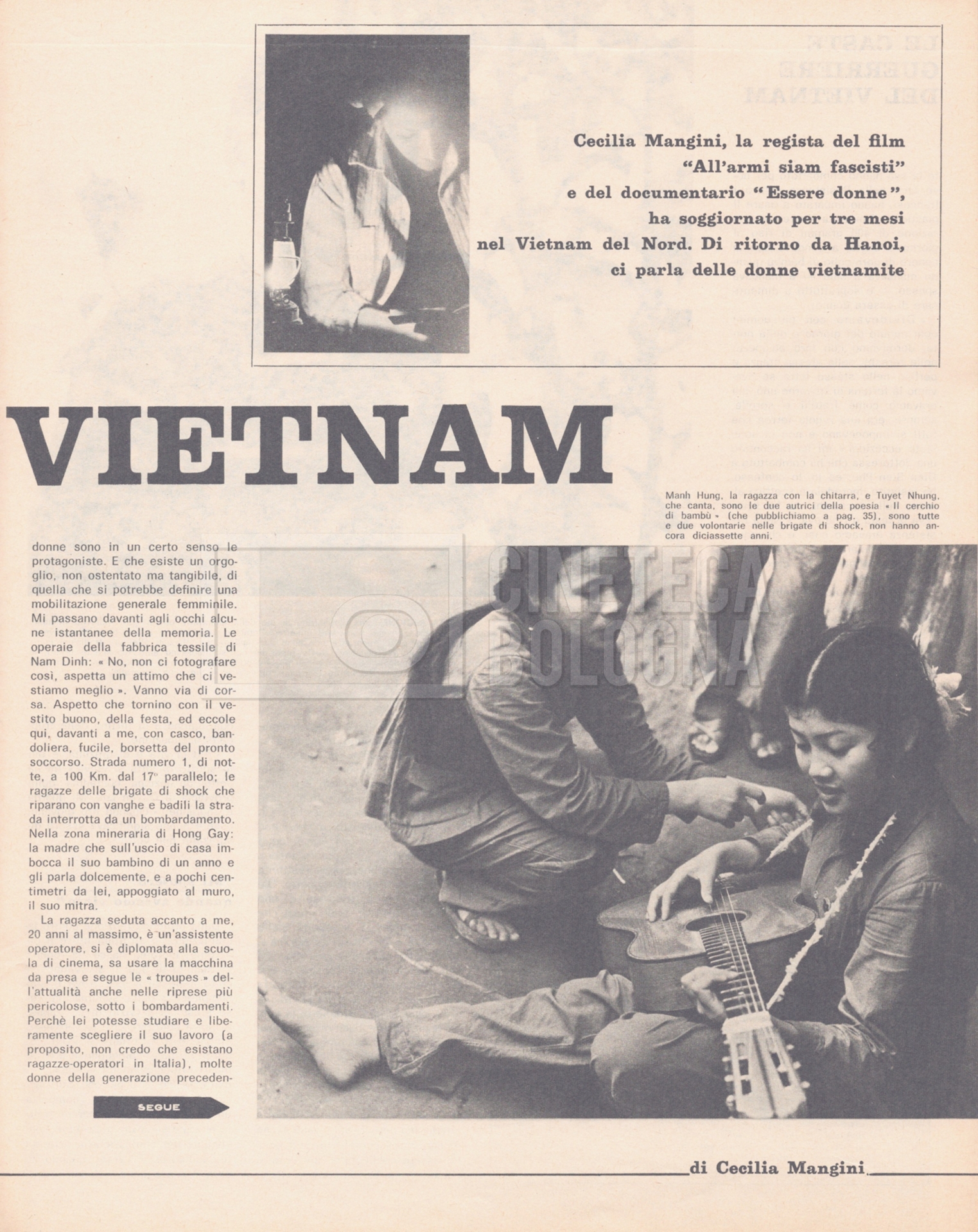 – “Noi donne”, a. XXI, 18 giugno 1966, n. 25 (Si segnala un’intervista a Cecilia Mangini dal titolo Le caste guerriere del Vietnam, corredata dalle fotografie che la regista ha scattato durante i tre mesi di permanenza ad Hanoi per il documentario mai realizzato, “Le Vietnam sera libre”);