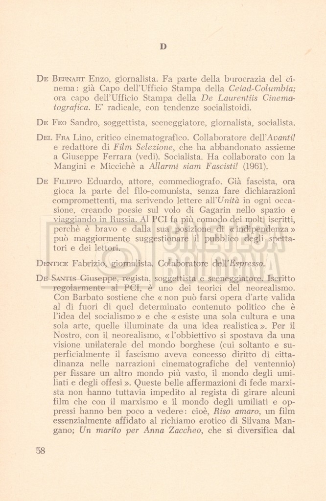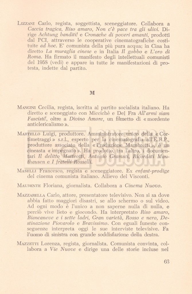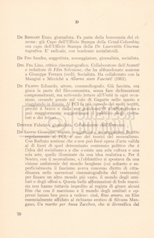 – “Cinema rosso. Rapporto sui comunisti e il cinema italiano”, a cura del Centro di Vita Italiana, Roma, Società tipografica Italia, 1962 (Appaiono le voci ‘Lino Del Fra’ e ‘Cecilia Mangini’, a p. 58 e 63);