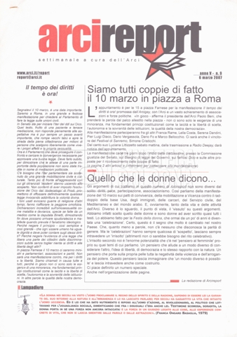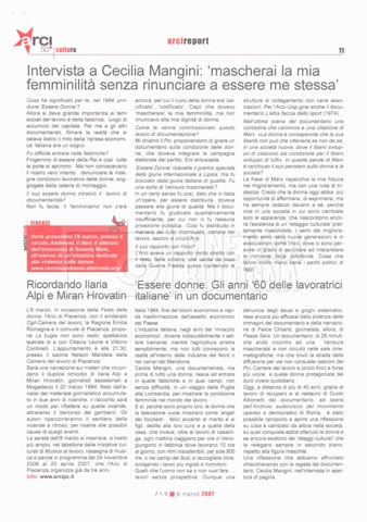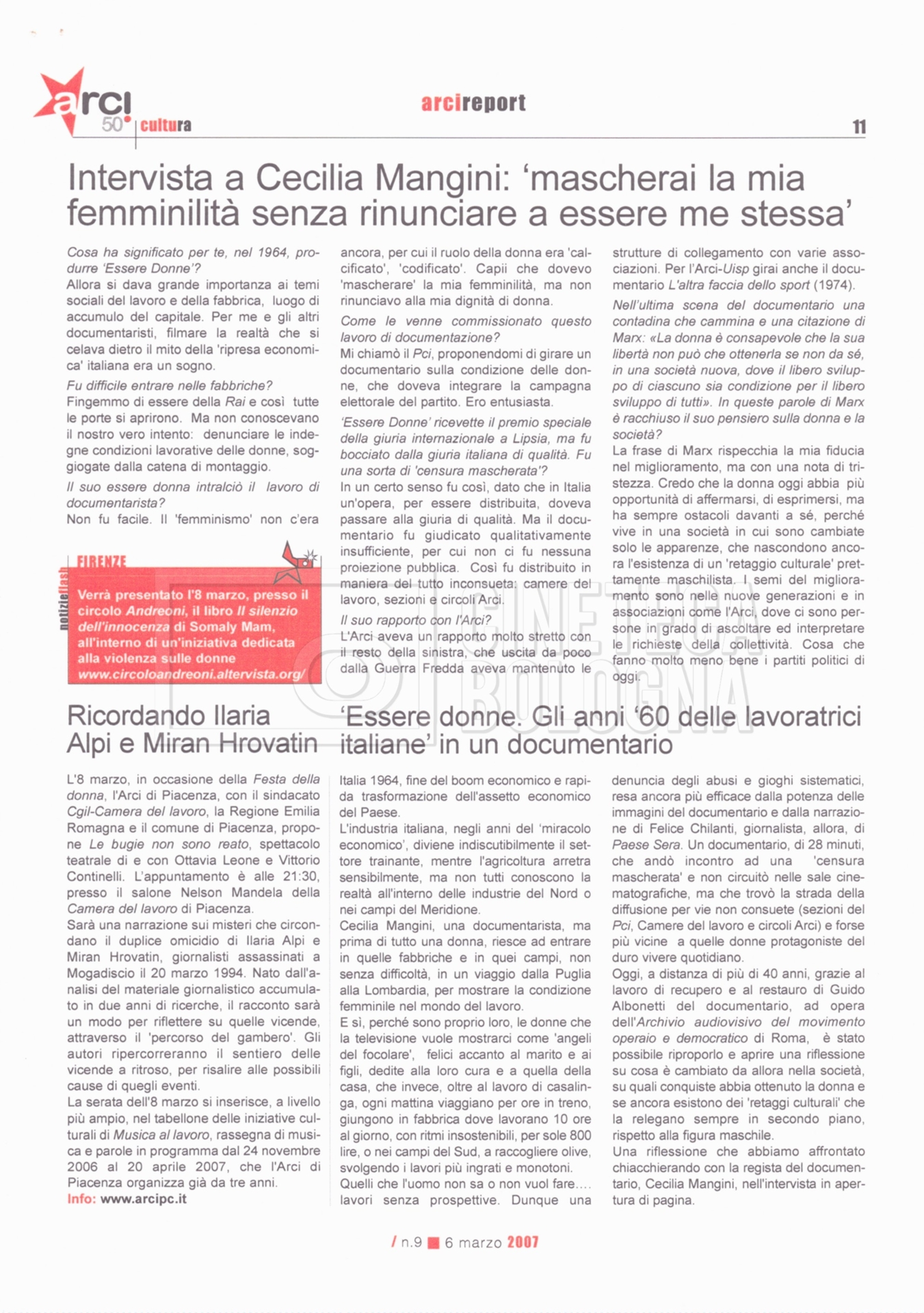 – “Arcireport. Settimanale a cura dell’ARCI”, a. V, 6 marzo 2007, n. 9 (Con segnalibro a indicare la pagina con l’intervista a Cecilia Mangini).