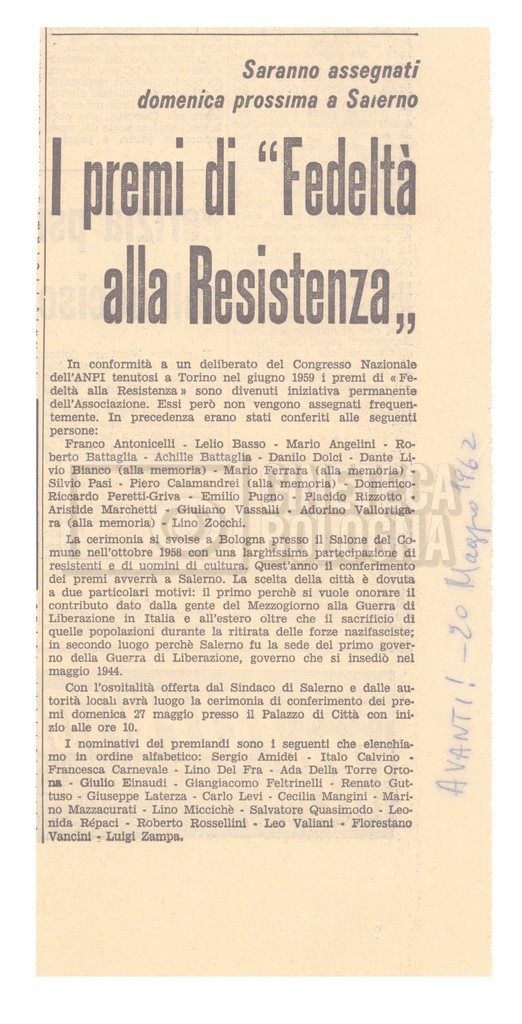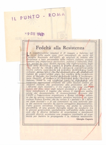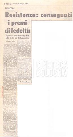Contiene rassegna stampa a proposito del Premio ‘Fedeltà alla Resistenza’, tra cui tre copie del periodico “Patria indipendente”, a. XI, 03 giugno 1962, n. 11.