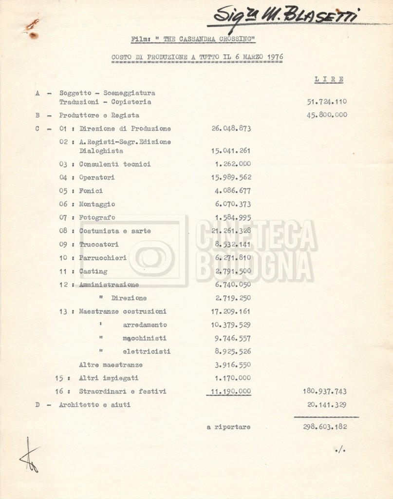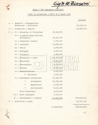 – Un riepilogo dei costi di produzione al 6 marzo 1976;