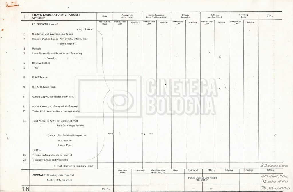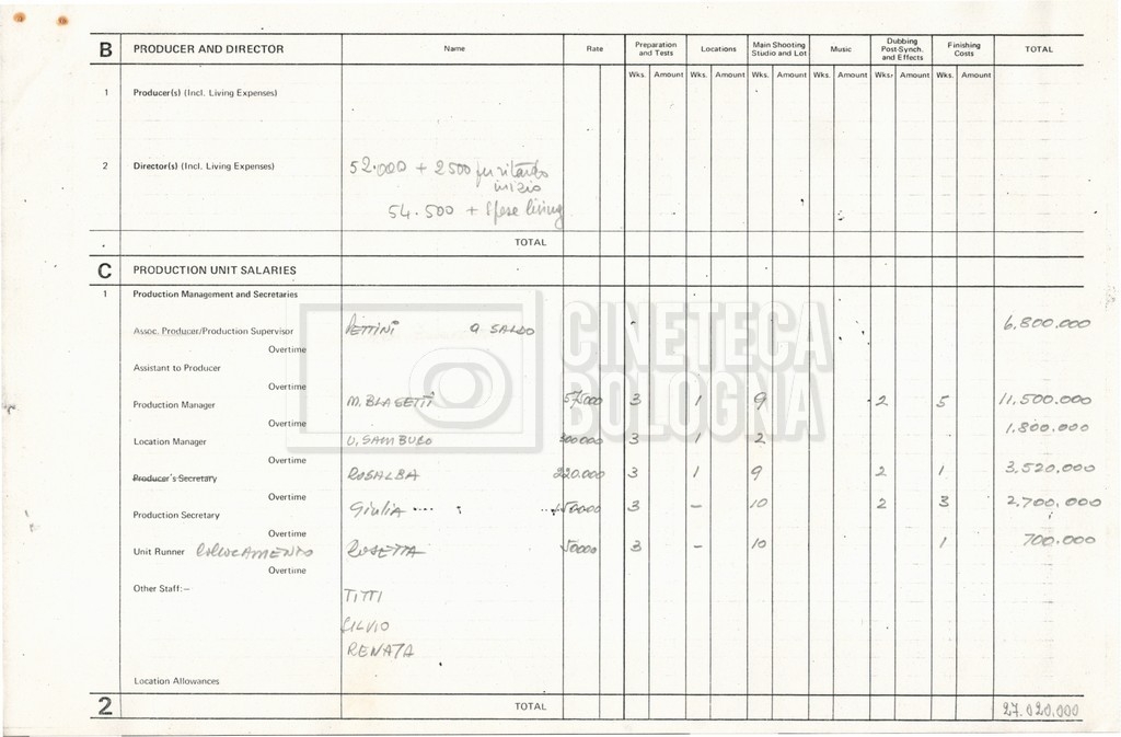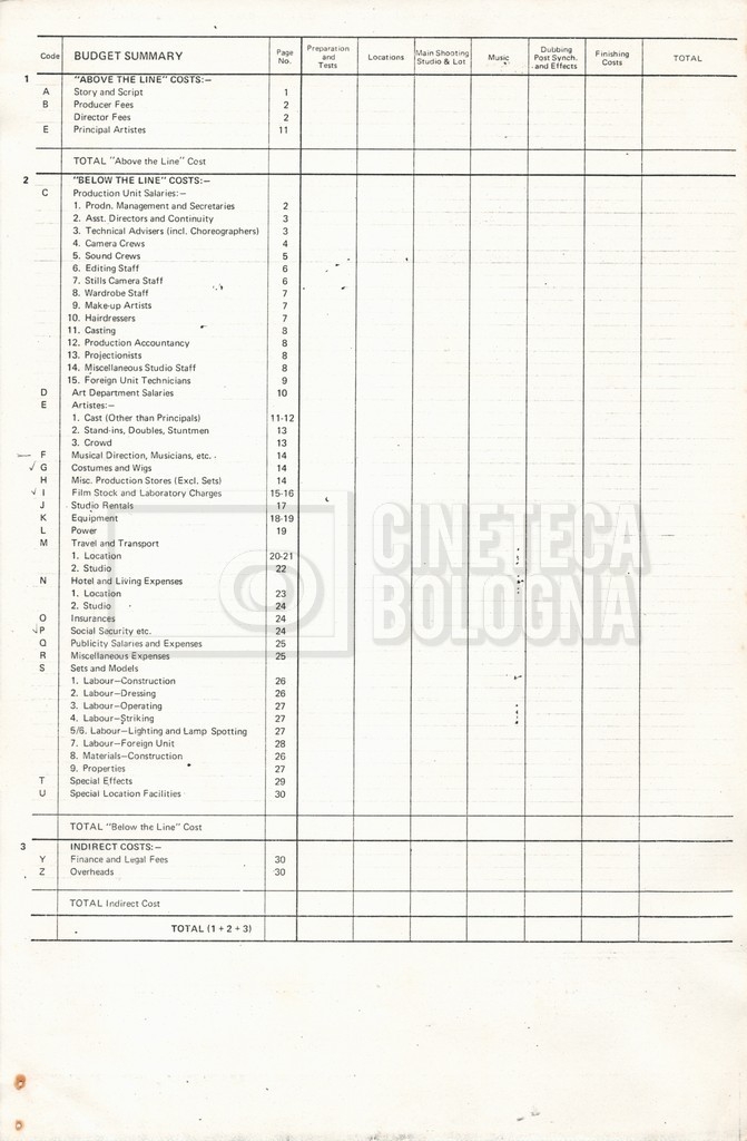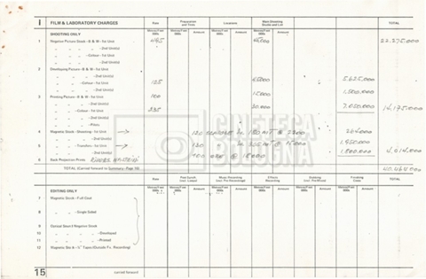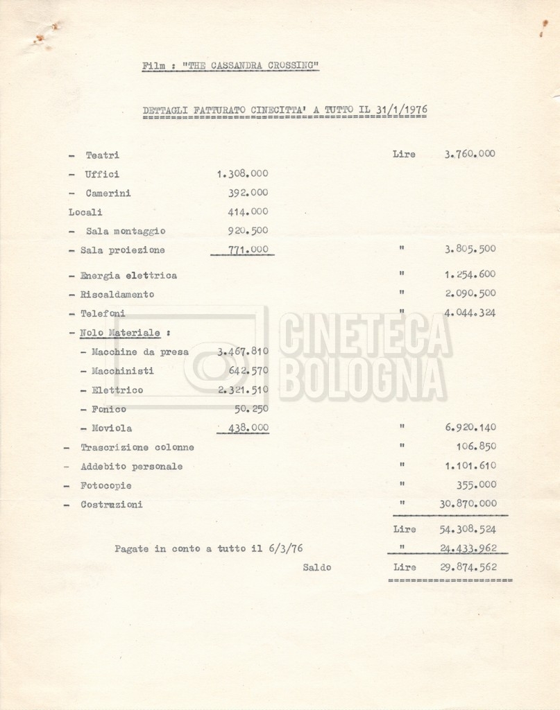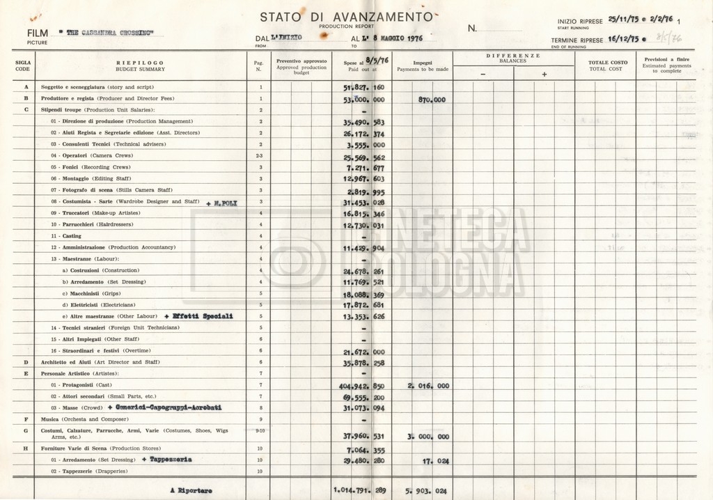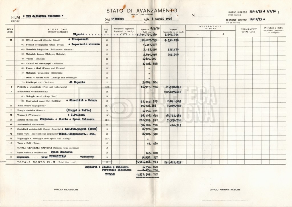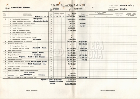 – Un riepilogo generale delle spese di produzione al 10 gennaio 1976;