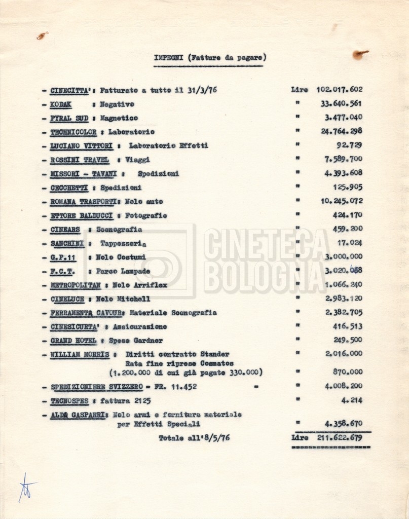 – Un riepilogo delle spese e degli impegni di produzione al 24 gennaio 1976;
