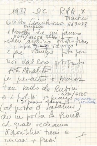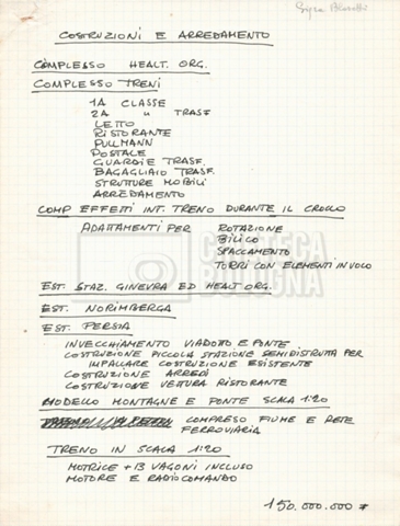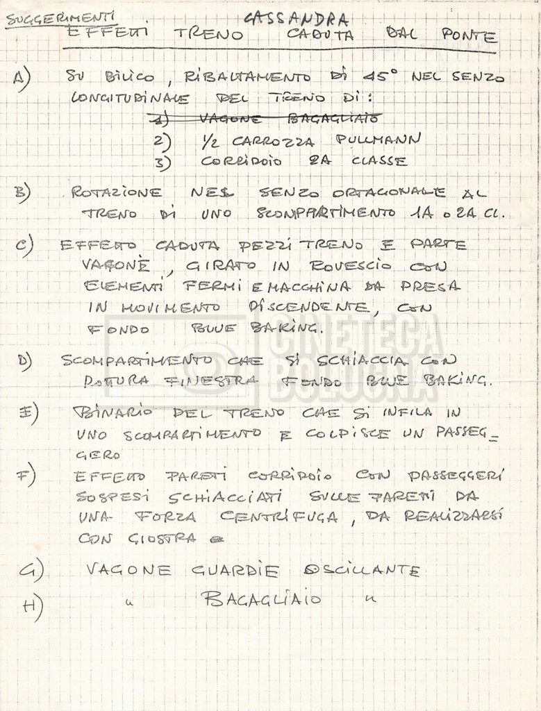 – “Cassandra notizie ferrovie, riprese treno ponte”: contiene notizie su ferrovie, treni, ponti ferroviari da utilizzare per le riprese del film;