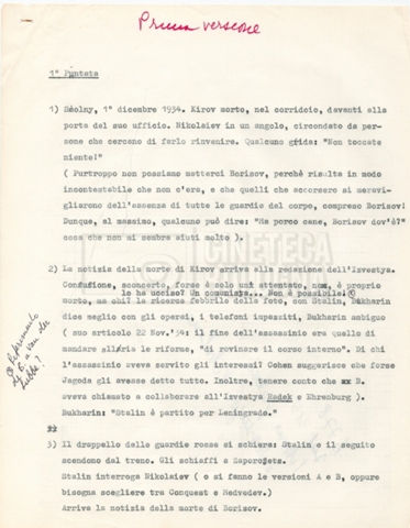“Rapporto sulla seconda puntata; scalette desunte dalla prima versione della sceneggiatura; scalette desunte dalla nuova versione della sceneggiatura; trattamento della prima puntata (con annotazioni)”