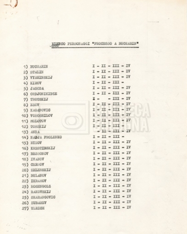 Contiene documentazione preparatoria, come i trattamenti, scalette, elenchi di personaggi e di ambientazioni, corrispondenza e, in particolare, materiale di studio, come appunti, rassegna stampa, articoli scientifici, saggi, bibliografie, riguardante la figura di Nikolaj Ivanovič Bucharin e il contesto politico in cui la sua carriera e il processo a suo carico ebbero luogo.