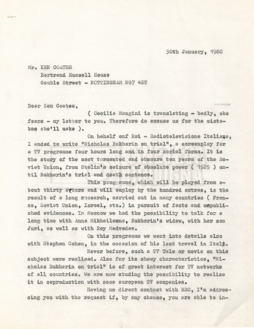 Il progetto di uno sceneggiato TV in quattro puntate, per la regia di Lino Del Fra, voleva ricostruire gli ultimi dieci anni (1928-1938) della vita e della carriera politica di Nikolaj Ivanovič Bucharin, tra gli organizzatori della Rivoluzione d’Ottobre, “figlio prediletto del partito” nelle parole testamentarie di Lenin, editorialista della “Pravda” e presidente del Comintern nel 1926. In particolare, Bucharin viene qui inquadrato nel progressivo allontanamento da ogni incarico di partito a causa dei dissidi con Iosif Stalin, finendo per essere arrestato nel 1937 sotto l’accusa di trockismo e sottoposto a processo l’anno successivo. Venne condannato a morte per fucilazione.