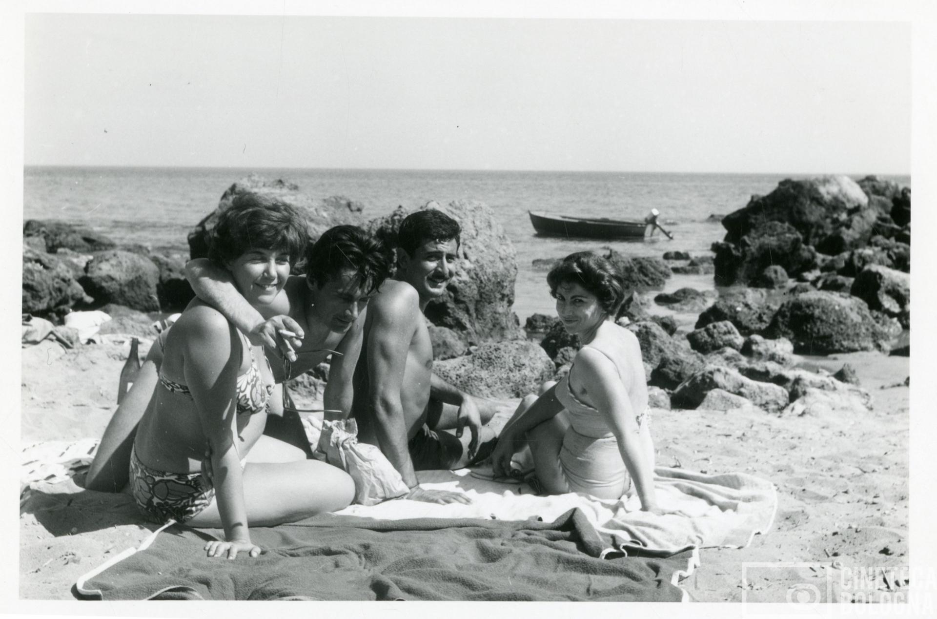 Punta Rossa. Mara Blasetti, Anna Gruber e due uomini non identificati durante le riprese del film Io amo, tu ami…