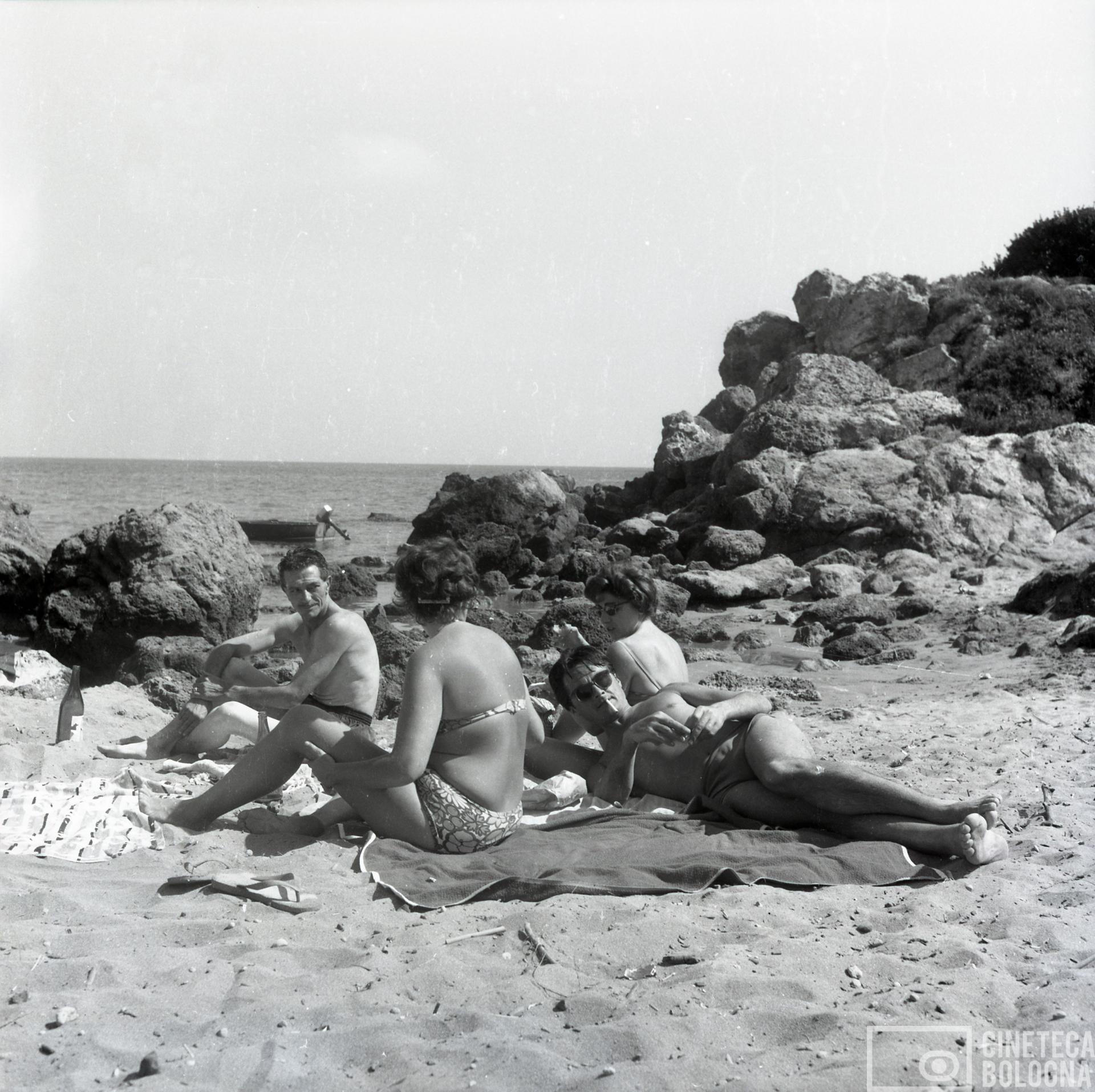 Punta Rossa. Mara Blasetti, Anna Gruber e due uomini non identificati durante le riprese del film Io amo, tu ami…