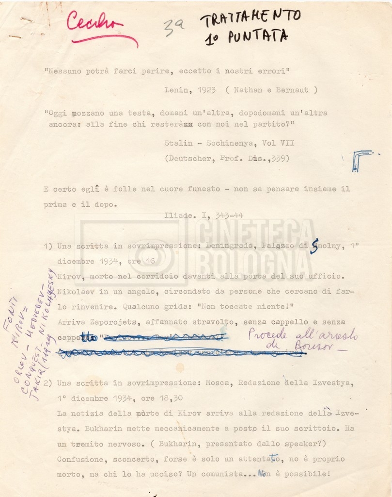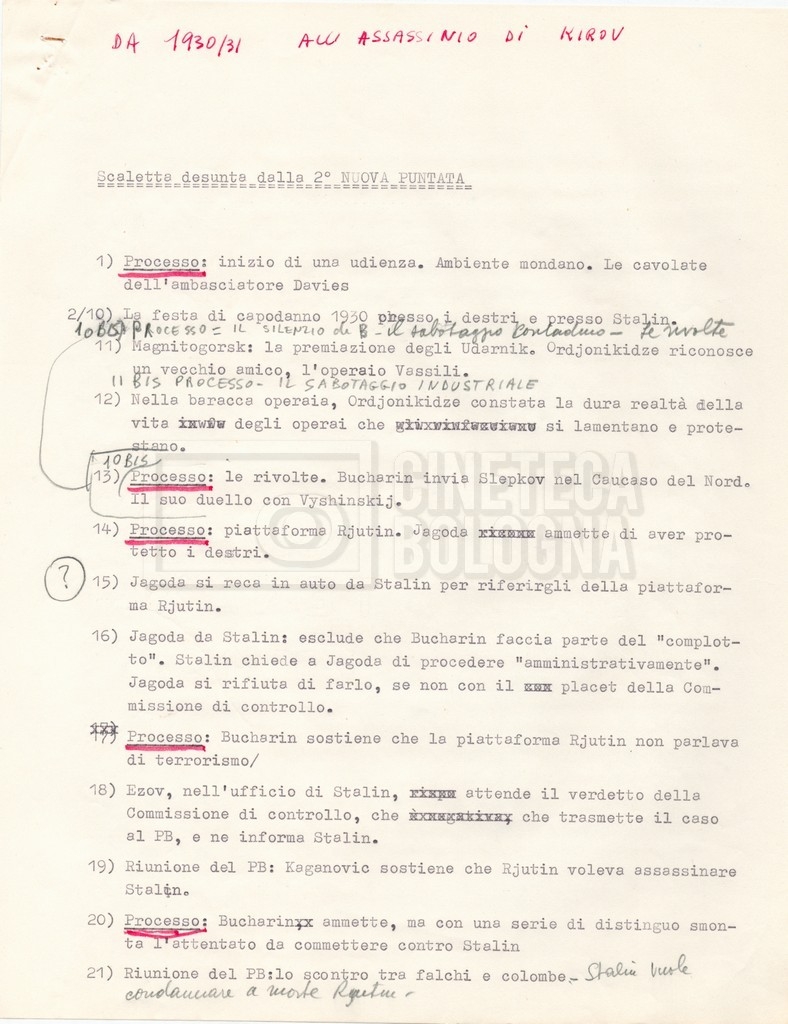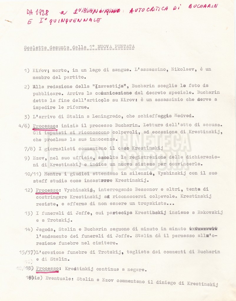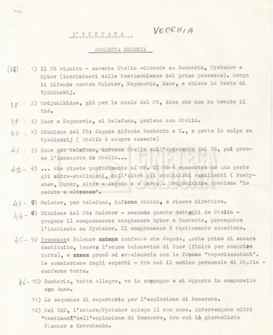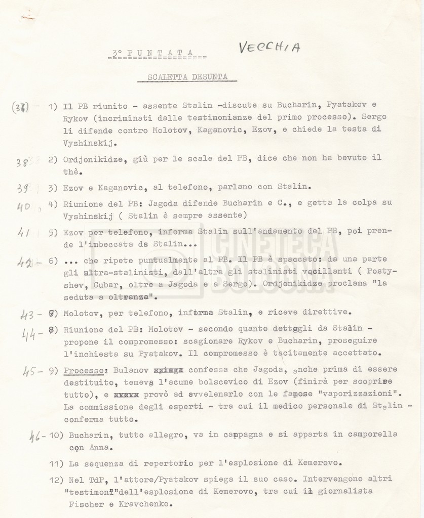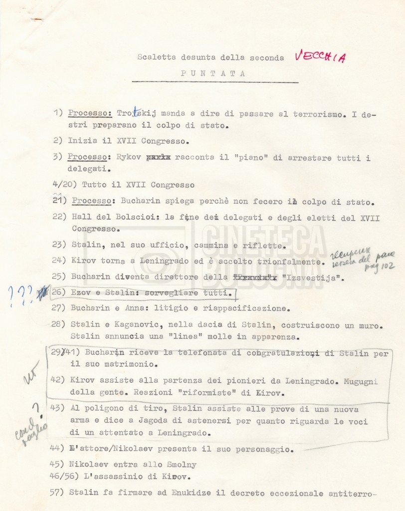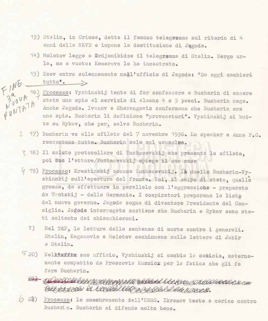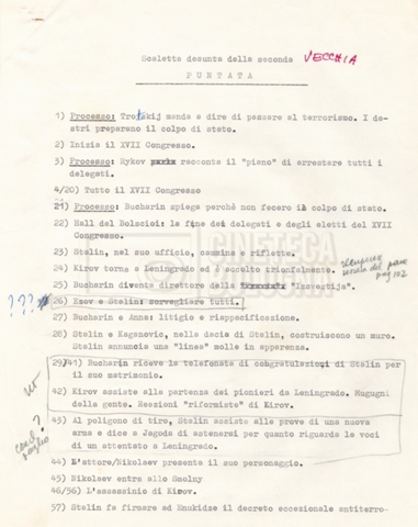 “Rapporto sulla seconda puntata; scalette desunte dalla prima versione della sceneggiatura; scalette desunte dalla nuova versione della sceneggiatura; trattamento della prima puntata (con annotazioni)”