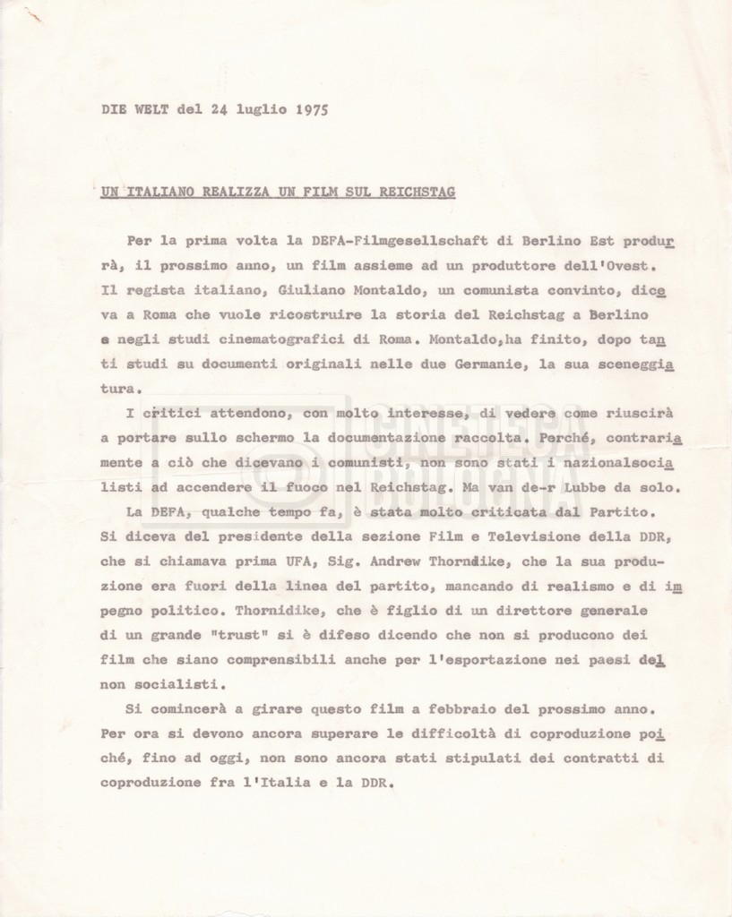 Contiene un solo articolo, con relativa fotocopia della traduzione in italiano, dal titolo tradotto Un italiano realizza un film sul Reichstag (“Die Welt” 24 luglio 1975).