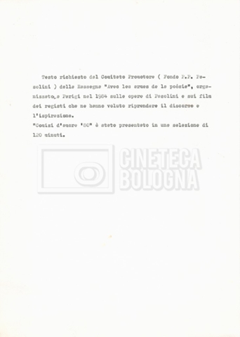 – Due copie di una scheda informativa, tecnica e critica, firmata da Cecilia Mangini e Lino Del Fra, preparata per la proiezione del film-inchiesta allinterno della rassegna Avec les armes de la poesie tenuta a Parigi nel 1984.