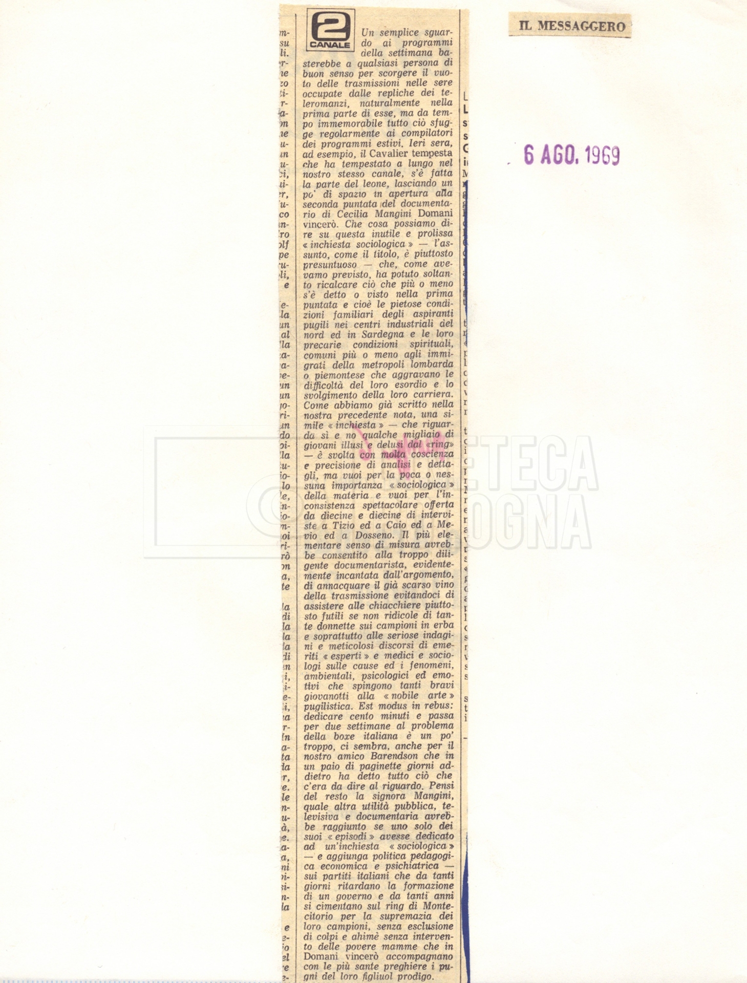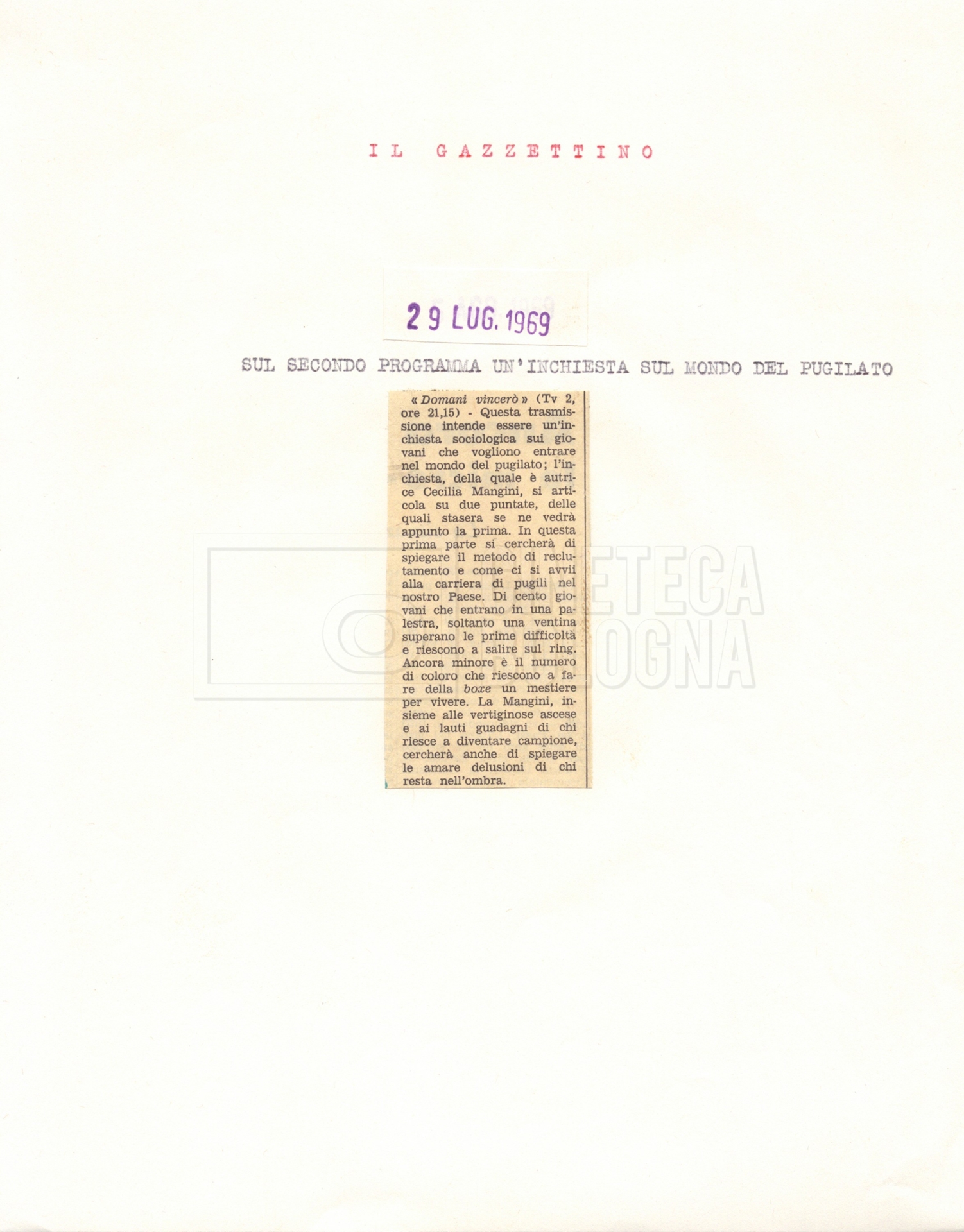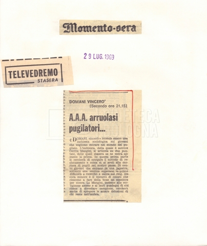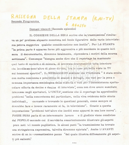 Torna alla banca dati “La rassegna stampa” Documento storico Fondo Cecilia Mangini – Lino Del Fra / “Documentari realizzati” / Domani vincerò Ambiti e contenuto Contiene i s.fascc.:– “Prima puntata, le segnalazioni”;– “Prima puntata, le recensioni”;– “Seconda puntata, le segnalazioni”;– “Seconda puntata, le recensioni”. Informazioni archivistiche Cronologia: 1969 Numero di ordinamento definitivo: 2.9.1 Numero di ordinamento provvisorio: 07.04 (s.fasc. 1) Descrizione fisica: fascicolo Immagini digitalizzate Informazioni sul film titolo originale: Domani vincerò regia: Mangini, Cecilia anno: 1969 lug. 29 – 1969 ago. 06 paese di produzione: Italia lingua principale: italiana Documenti correlati Vai alla banca dati DOCUMENTO STORICO Materiale preparatorio e ricezione del documentario