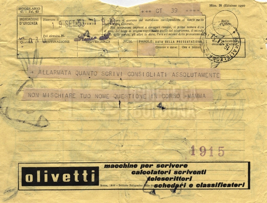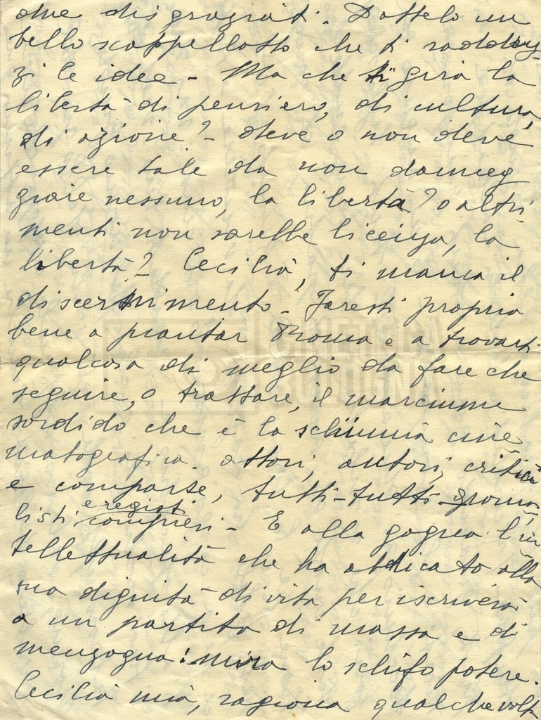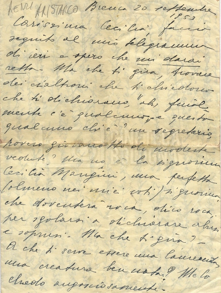 Torna alla banca dati “Renzi – Aristarco. ‘L’armata Sagapò’; I consigli di mia madre” Documento storico Fondo Cecilia Mangini – Lino Del Fra / “Corrispondenza” Ambiti e contenuto Contiene un telegramma e una lettera inviati a Cecilia Mangini dalla madre, preoccupata del suo coinvolgimento nel caso Renzi-Aristarco. Informazioni archivistiche Cronologia: 19 settembre 1953 – 20 settembre 1953 Numero di ordinamento definitivo: 15.3 Numero di ordinamento provvisorio: 01.03 Descrizione fisica: fascicolo Immagini digitalizzate Documenti correlati Vai alla banca dati DOCUMENTO STORICO Partecipazione alla ‘Settimana internazionale del cinema’ di Mannheim DOCUMENTO STORICO Assegnazione del gran premio leone di San Marco a Fata Morgana DOCUMENTO STORICO “Renzi – Cappelli per ‘La legge’ di Dassin” DOCUMENTO STORICO Libero Solaroli DOCUMENTO STORICO Federazione italiana dei circoli del cinema (FICC) – Assemblea cineclub ‘Primi piani’ DOCUMENTO STORICO Alain Resnais e René Clair DOCUMENTO STORICO Cesare Zavattini DOCUMENTO STORICO “Wystan Hugh Auden. Mio articolo; corrispondenza; sua lettera autografa; ipotesi di traduzione” DOCUMENTO STORICO “Corrispondenza Festival del documentario di Lipsia” DOCUMENTO STORICO “Corrispondenza Di Lino Del Fra con Adelio Ferrero, Pio Baldelli, Paolo Gobetti, Paolo Grassi” DOCUMENTO STORICO Alessandro Pugno