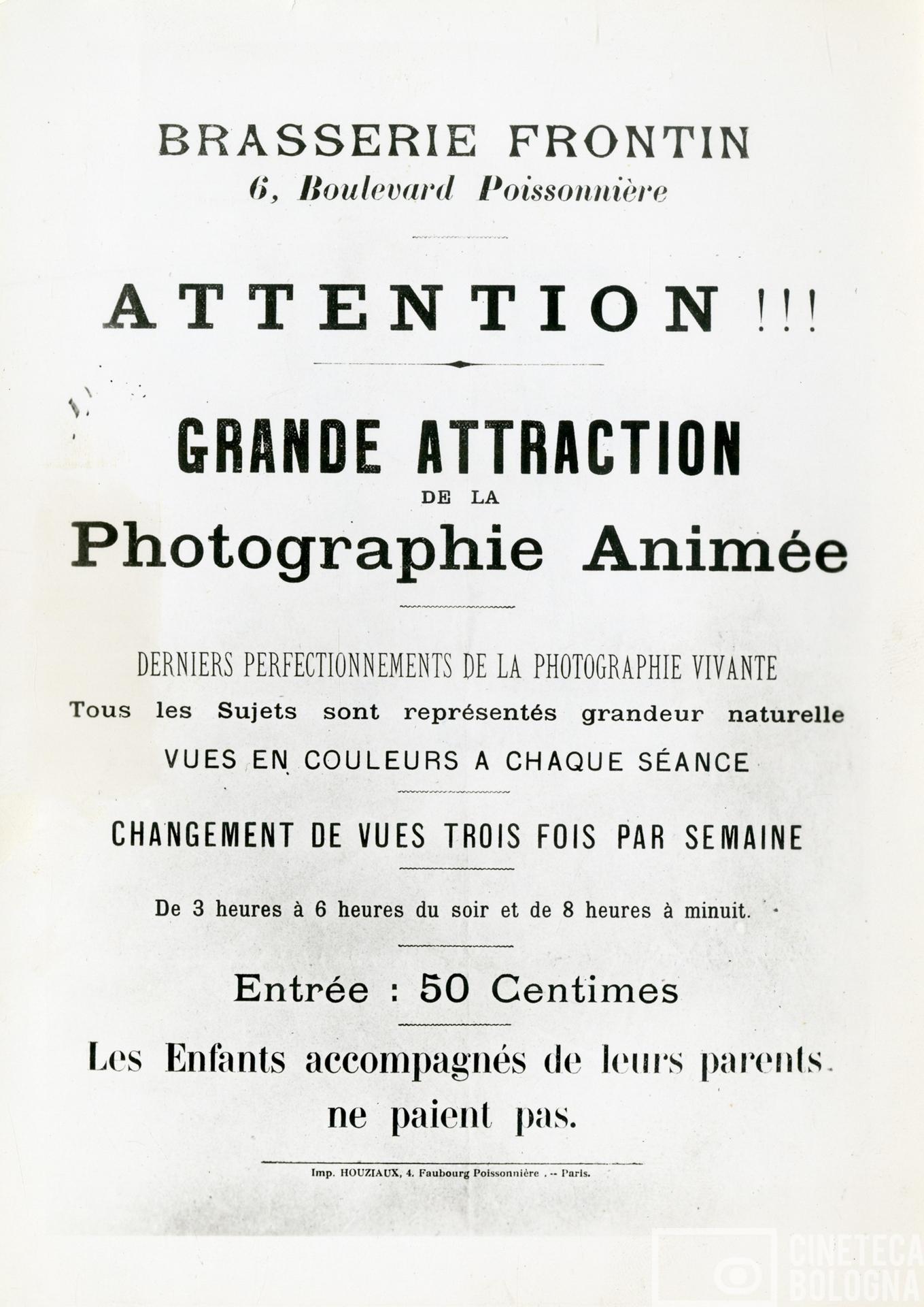 Riproduzione di un affisso di un’attrazione fotografica animata. Brasserie Frontin, 6 Boulevard Poissonnière, Parigi