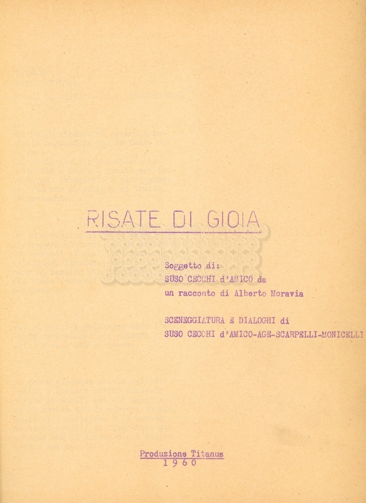 Trattasi di una sceneggiatura di Suso Cecchi d’Amico, Mario Monicelli, Age e Scarpelli, scritta a partire da un soggetto di Suso Cecchi d’Amico. Il soggetto è tratto da due novelle di Alberto Moravia, Le risate di gioia e Ladri in chiesa, pubblicate nell’opera Racconti romani (Bompiani, 1954). La regia di Risate di gioia (1960) è di Mario Monicelli e nella pellicola vengono accreditati alla sceneggiatura gli stessi quattro autori di cui sopra.