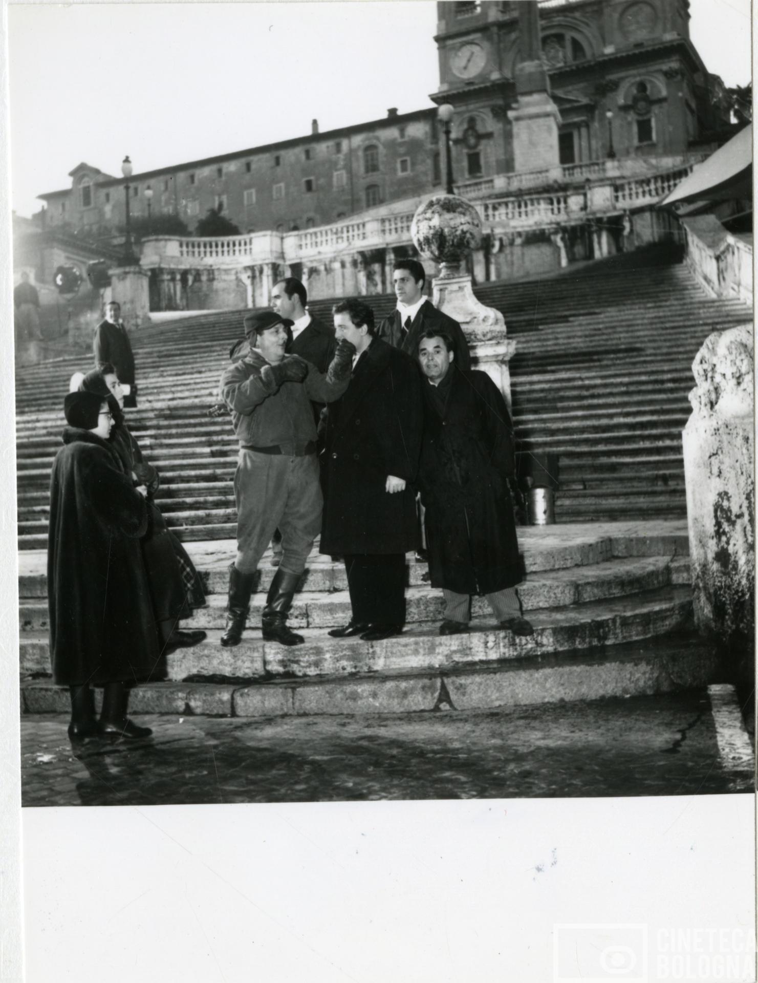 Roma. Mara Blasetti, Alessandro Blasetti, Domenico Modugno e la troupe a Piazza di Spagna durante le riprese del film Europa di notte