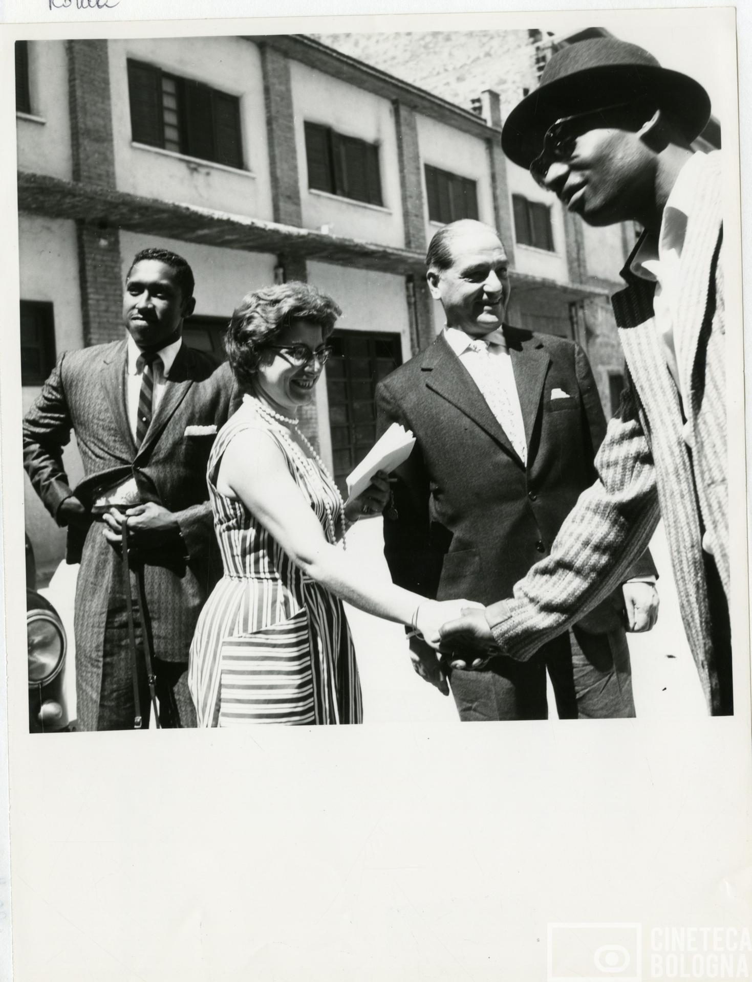 Roma. Mara Blasetti con Nate Nelson e Gaynel Hodge del gruppo musicale dei Platters e un uomo non identificato durante le riprese di Europa di notte