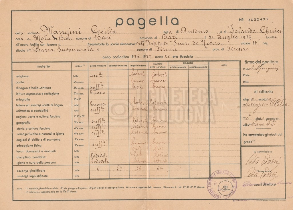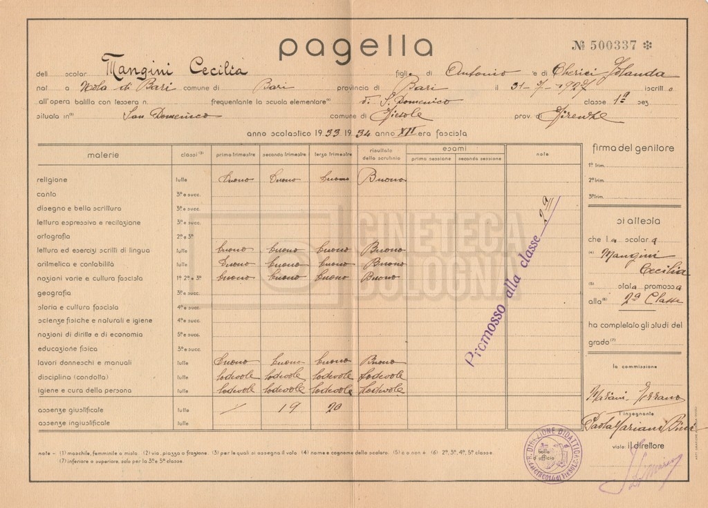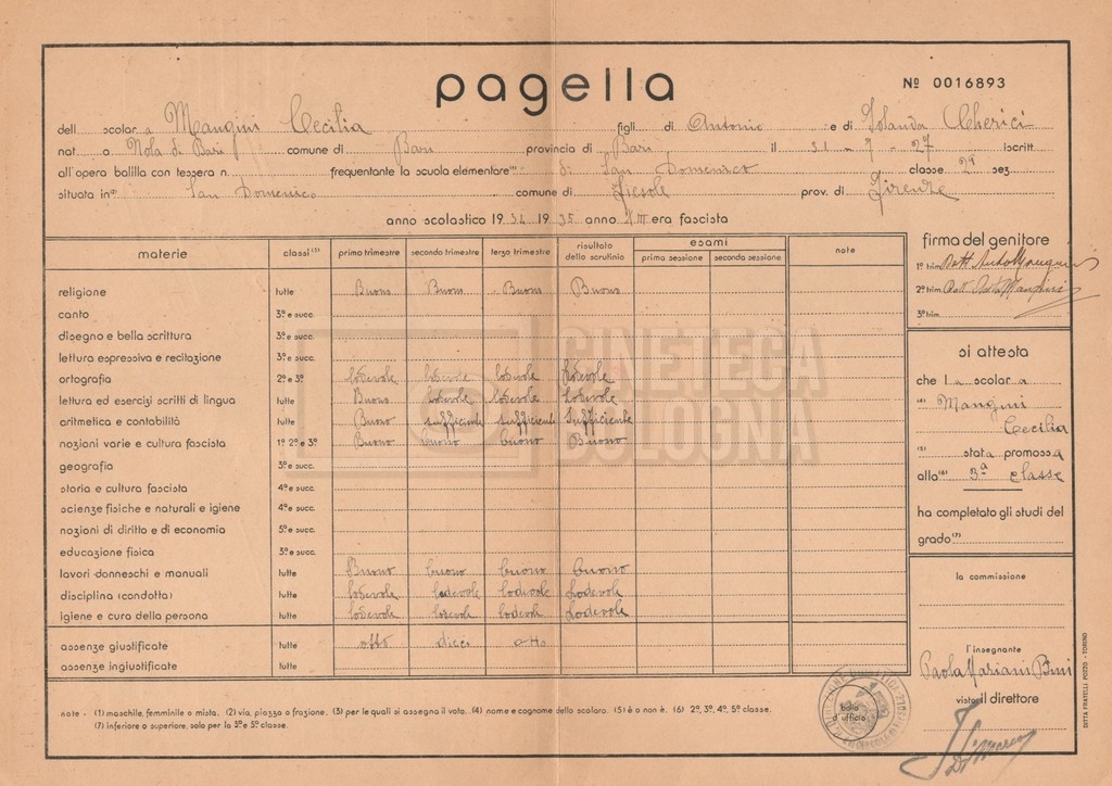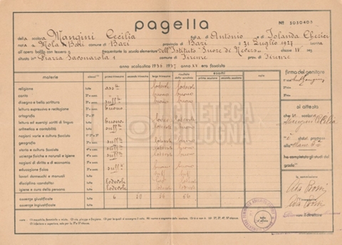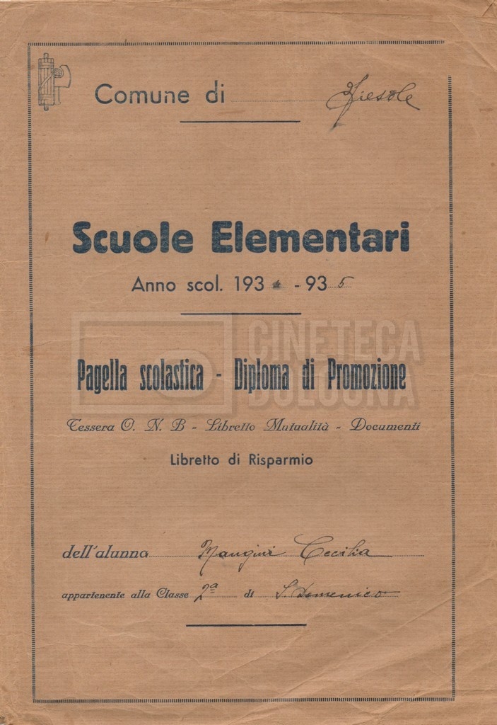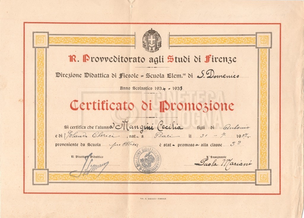 – Un certificato di promozione di Cecilia Mangini alla classe terza (1934-1935);