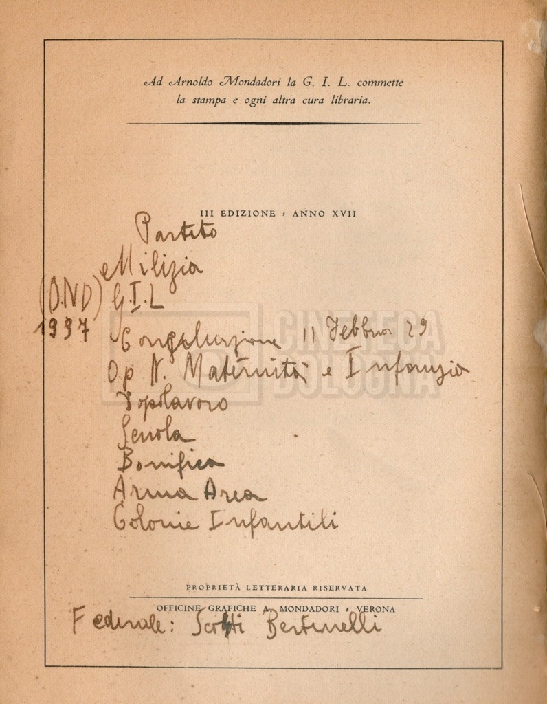 – Il primo libro del fascista, a cura del ‘Partito nazionale fascista’ (PNF), Verona, Mondadori, 1928-1929;