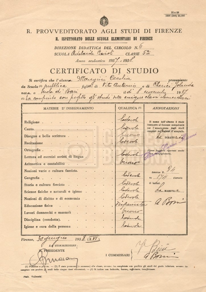– Certificato di studio rilasciato al termine delle elementari dal ‘Regio provveditorato agli studi di Firenze’ (1937-1938);