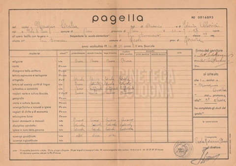 - Un certificato di promozione di Cecilia Mangini alla classe terza (1934-1935);