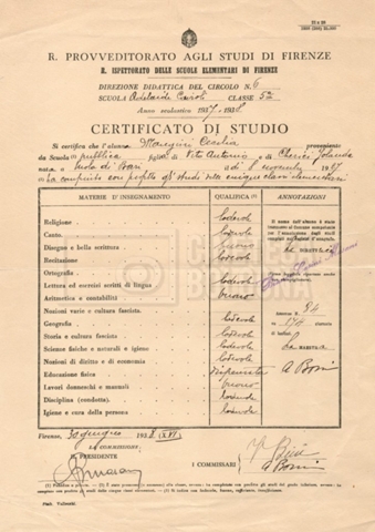 - Certificato di studio rilasciato al termine delle elementari dal 'Regio provveditorato agli studi di Firenze' (1937-1938);