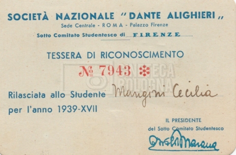 – Due tessere di iscrizione alla ‘Società nazionale Dante Alighieri’ (anno 1935 e anno 1939);