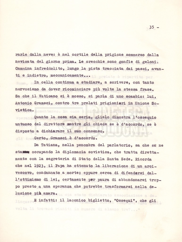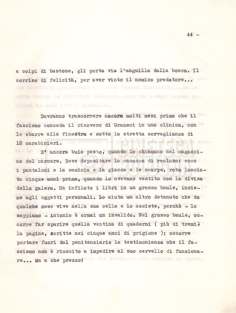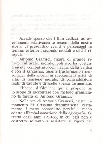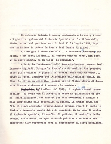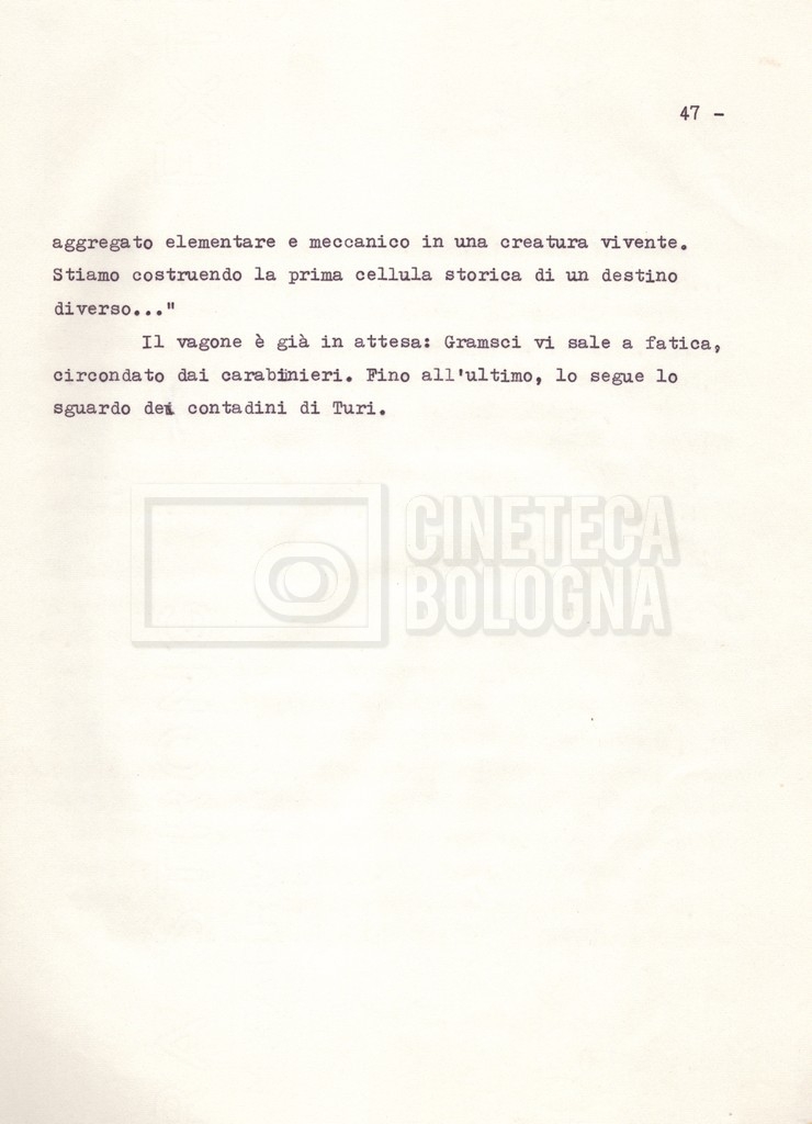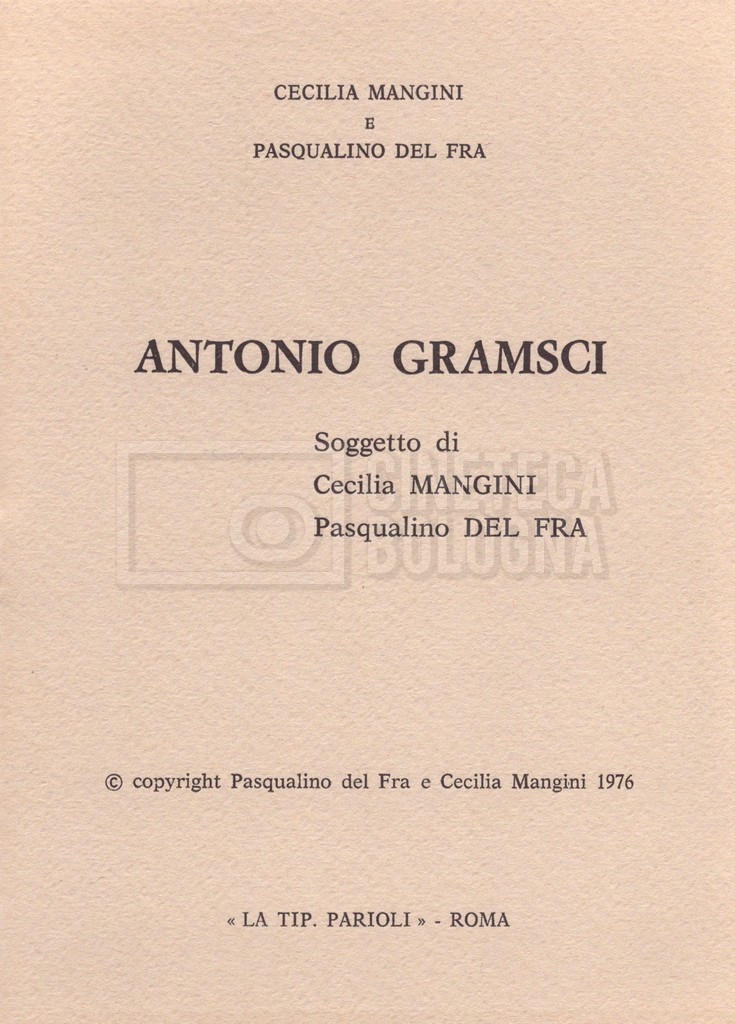 Torna alla banca dati “Il soggetto stampato; trattamento; trattamento in francese” Documento storico Fondo Cecilia Mangini – Lino Del Fra / “Film di fiction realizzati” / “Antonio Gramsci – I giorni del carcere” Ambiti e contenuto Contiene:– Tre copie del soggetto, a stampa;– Due copie del trattamento, di cui una in fotocopia;– Il trattamento in francese. Informazioni archivistiche Cronologia: 1976 Numero di ordinamento definitivo: 4.2.3 Numero di ordinamento provvisorio: 11.03 Descrizione fisica: fascicolo Immagini digitalizzate Informazioni sul film titolo originale: Antonio Gramsci – I giorni del carcere regia: Del Fra, Lino anno: 1977 paese di produzione: Italia lingua principale: italiana Documenti correlati Vai alla banca dati DOCUMENTO STORICO “Preventivo; piano di lavorazione (il primo)” DOCUMENTO STORICO “Prima versione sceneggiatura; scaletta desunta” DOCUMENTO STORICO “Diari di lavorazione” DOCUMENTO STORICO “Appunti per la sceneggiatura” DOCUMENTO STORICO “Ordini del giorno” DOCUMENTO STORICO “Il casting; gli ambienti” DOCUMENTO STORICO “Durante le riprese” DOCUMENTO STORICO “I titoli di testa; i titoli di coda; le percentuali di grandezza” DOCUMENTO STORICO “Lettere sul film; nota bene: presidente della Camera dei deputati era Sandro Pertini” DOCUMENTO STORICO “I contratti degli attori” DOCUMENTO STORICO “Scene soppresse” DOCUMENTO STORICO “Antonio Gramsci; copia edizione” DOCUMENTO STORICO “Antonio Gramsci; sceneggiatura” DOCUMENTO STORICO “Antonio Gramsci; copia doppiaggio” DOCUMENTO STORICO “Antonio Gramsci; dialoghi definitivi per il doppiaggio e per il ministero” DOCUMENTO STORICO “Materiale Italnoleggio” DOCUMENTO STORICO “Interviste a Lino Del Fra” DOCUMENTO STORICO “Riprese” DOCUMENTO STORICO “Corrispondenza con Claude Ledû” DOCUMENTO STORICO Rassegna stampa